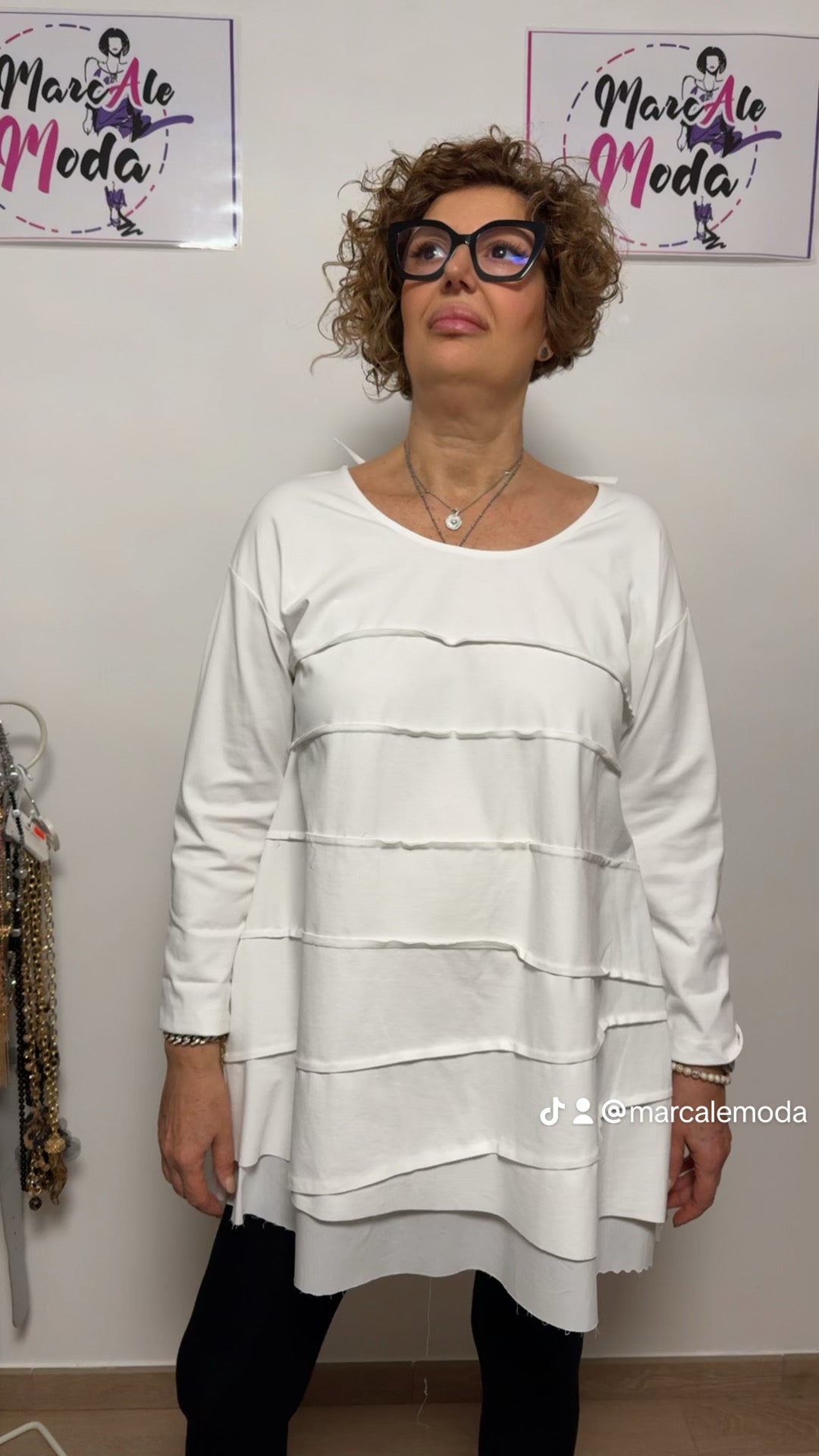 Blusa brand sartoriale Wendy Trendy tessuto cotone punto Roma, lavorato a righe orizzontali in rilievo, leggero scollo dietro , parte finale con stoffa che esce per abbellimento , spacchetto dietro altezza fondoschiena.