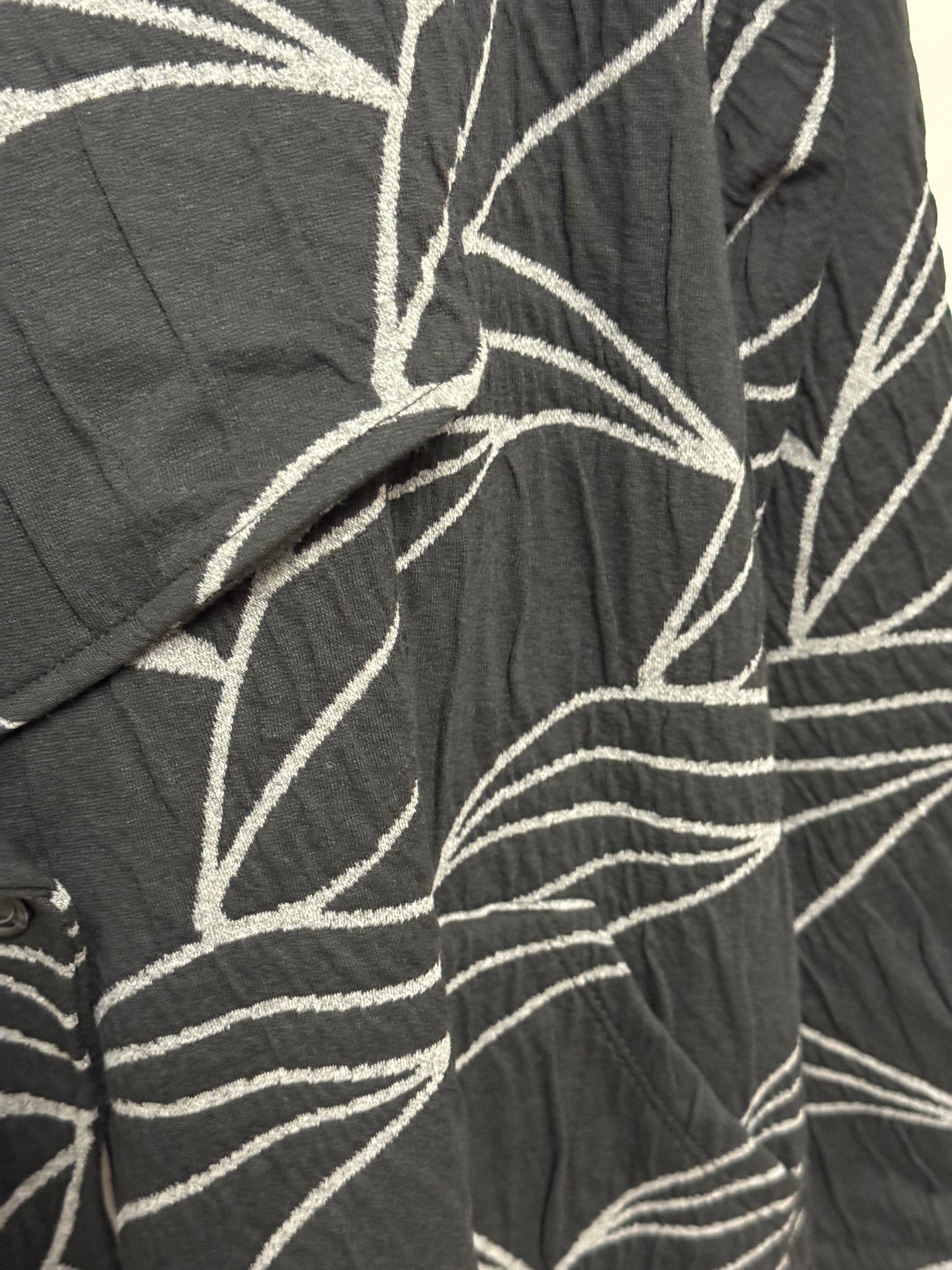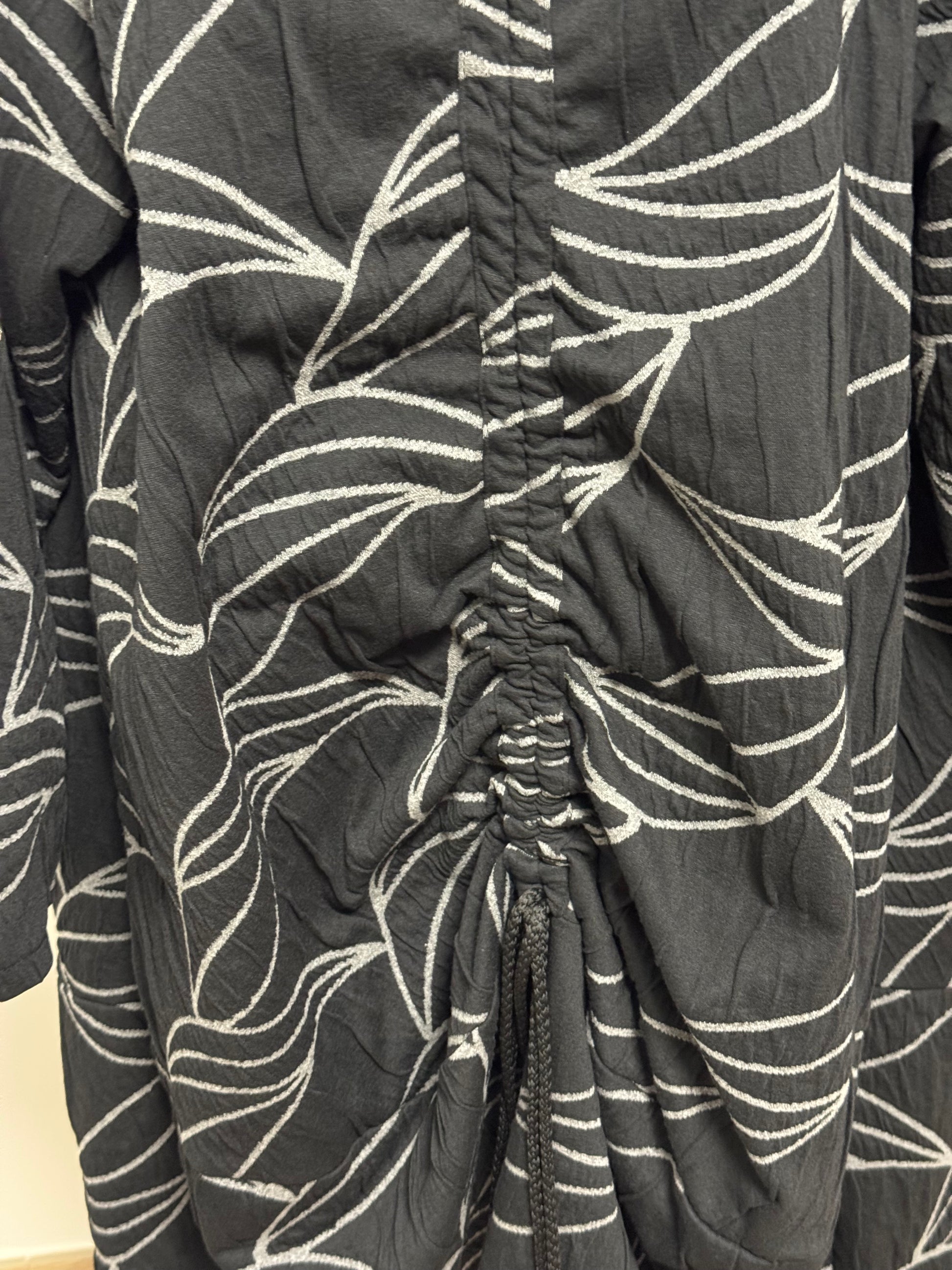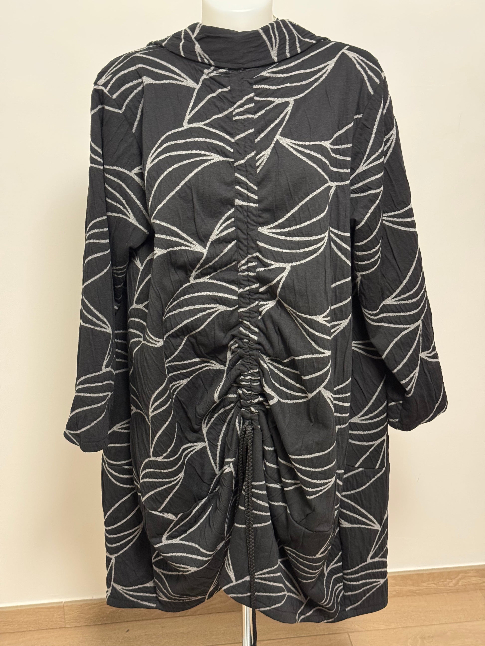 Cappotto linea 158C tessuto fiammato effetto 3D base nera e striature grigio argento . Dietro particolarità dell’arricciatura con culisse regolabile . Abbottonatura sul davanti .