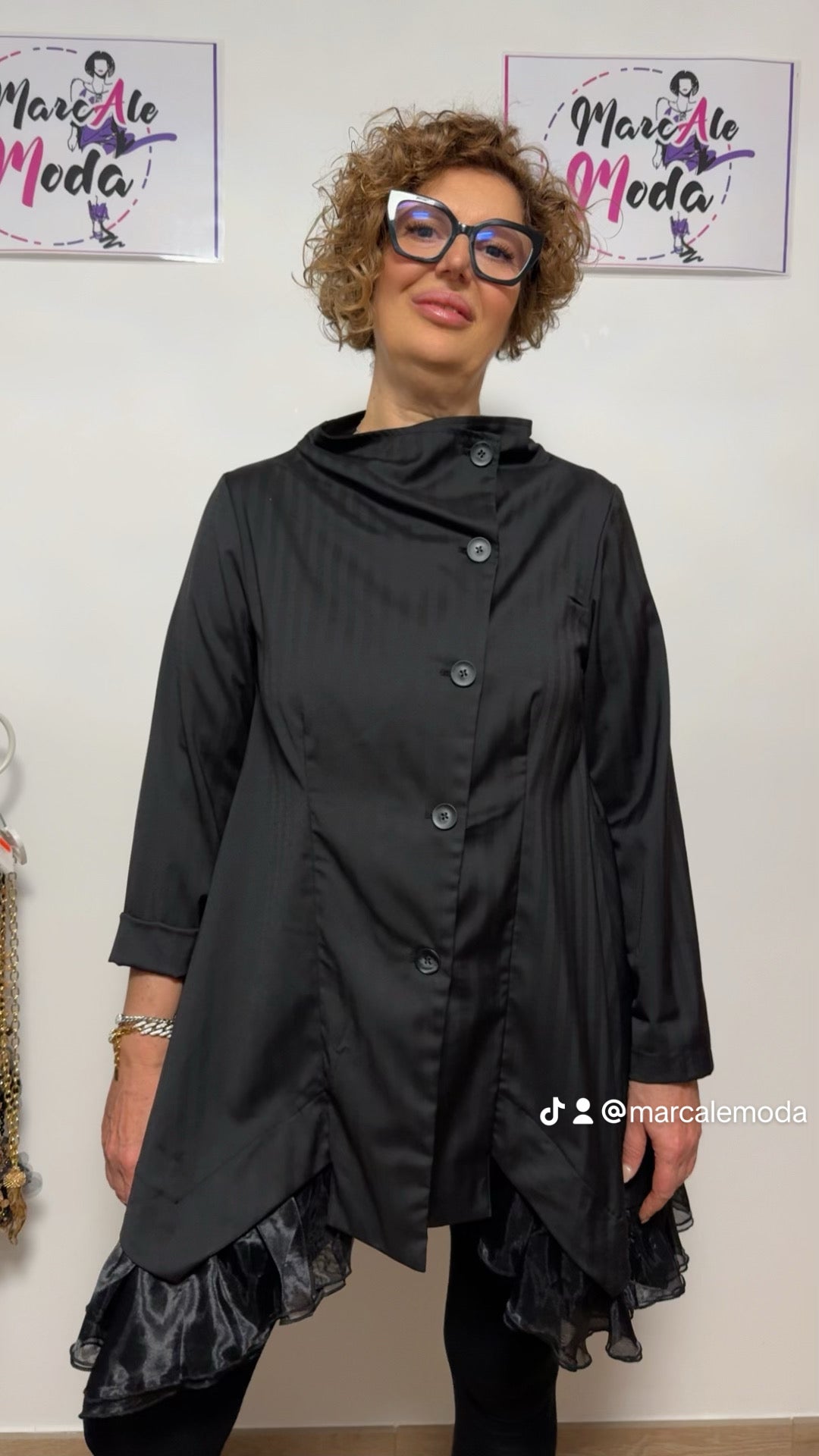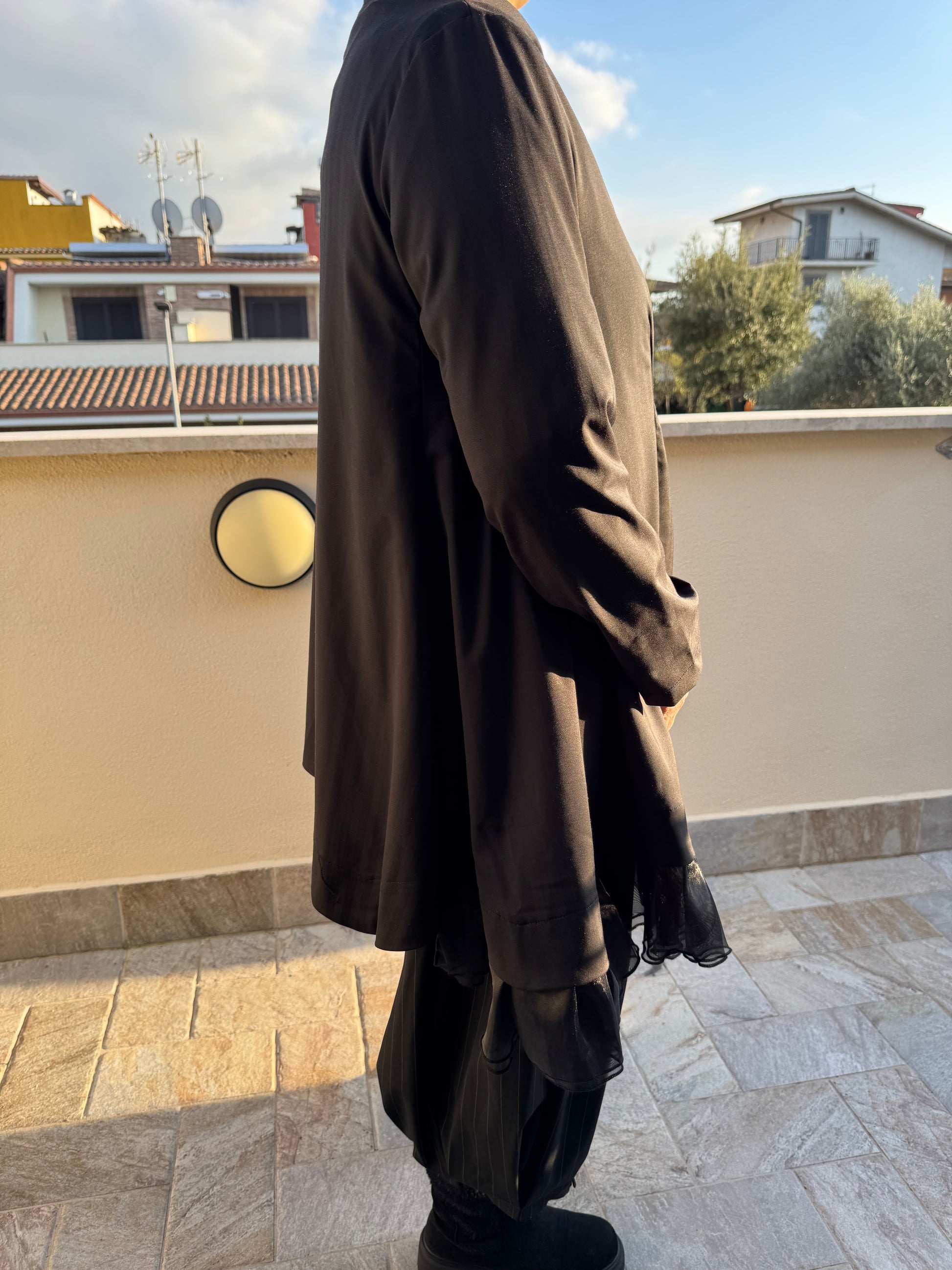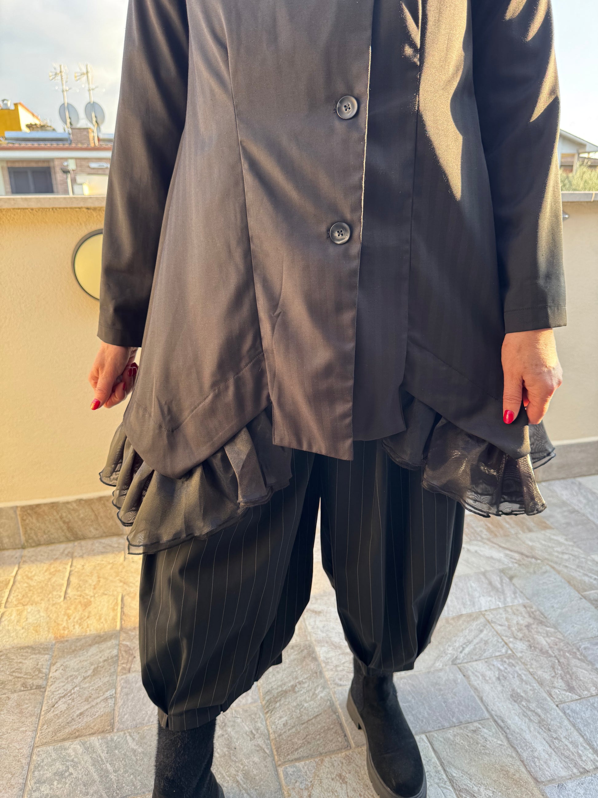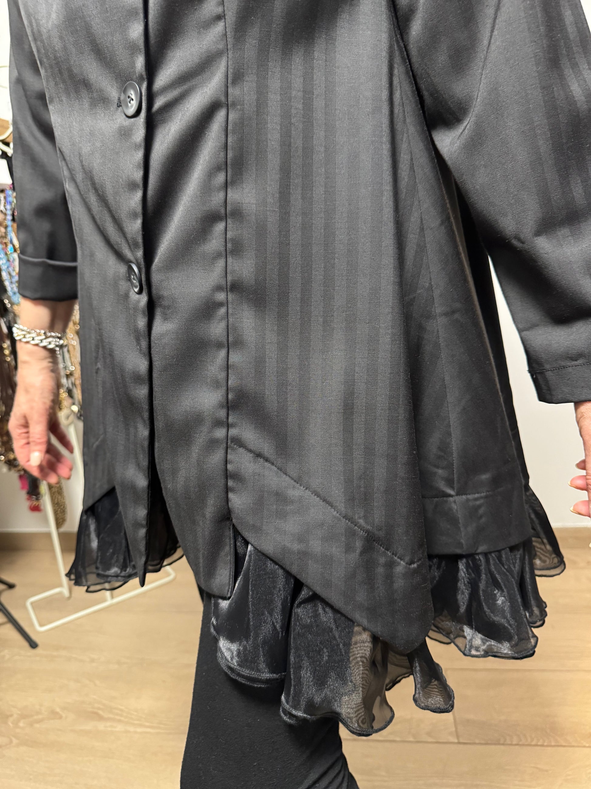 Giacca brand sartoriale Wendy Trendy , esempio di bellezza assoluta e di knowhow sartoriale, dalla produzione del tessuto al taglio ed assemblaggio di cuciture e rifiniture. Tessuto effetto gessato particolare tono su tono, allacciatura con bottoni in diagonale, davanti un piccolo gioco di scalatura e poi laterale tutta una rouge di tafta.
