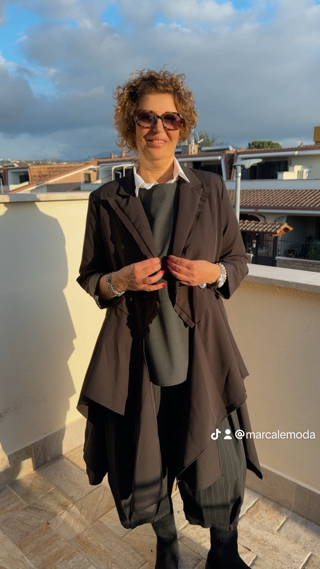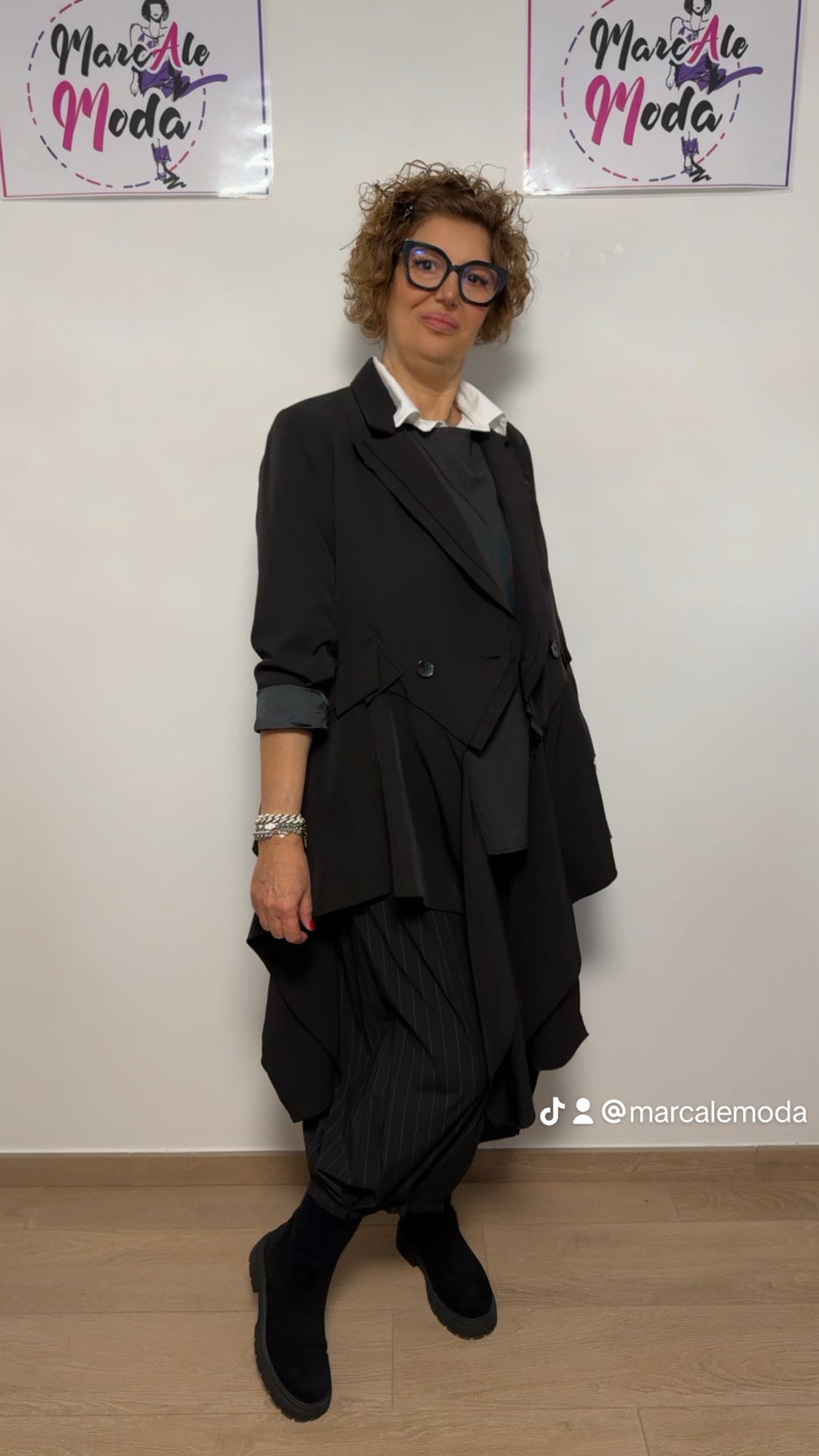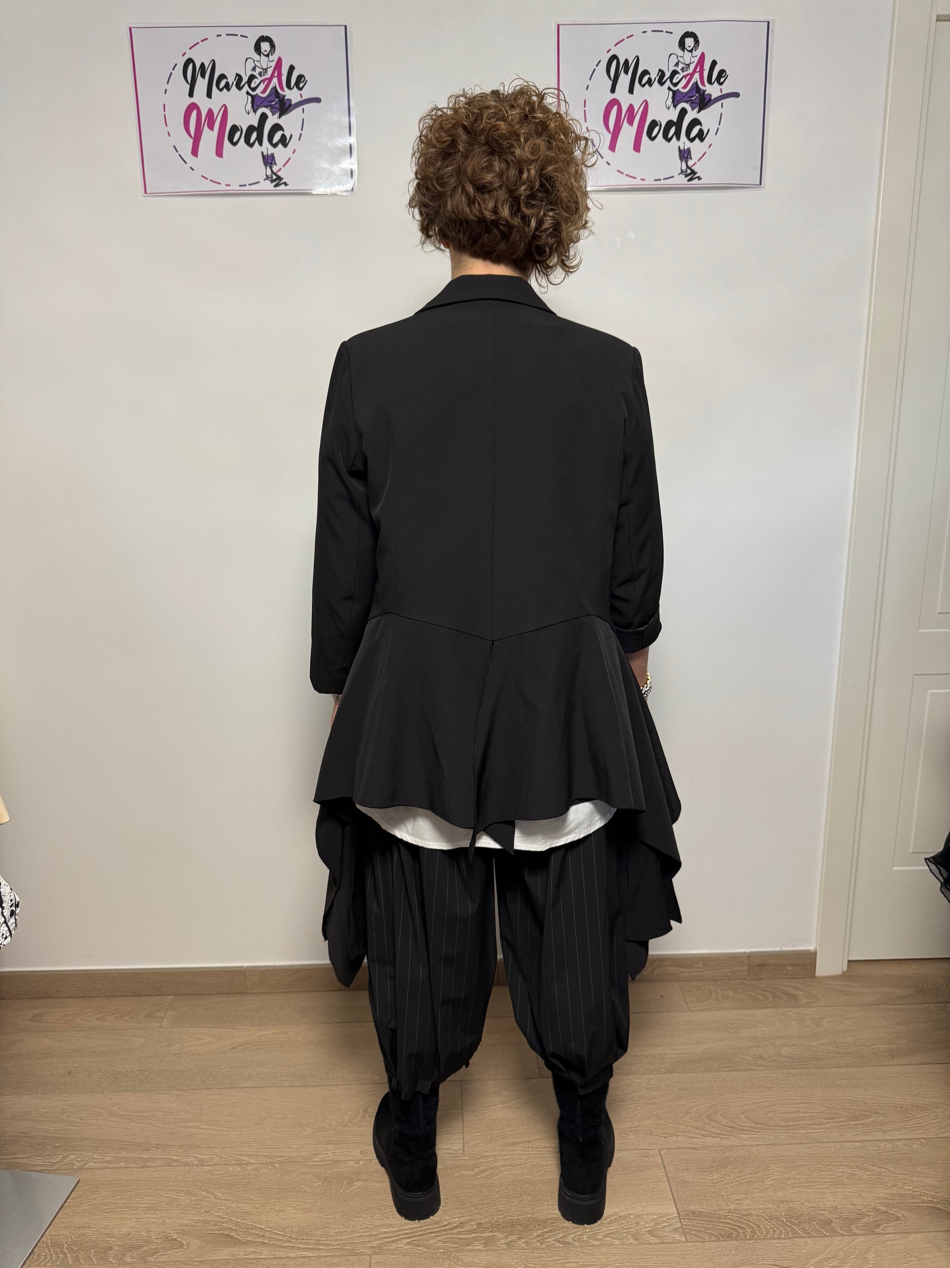 Giacca brand sartoriale Wendy Trendy , allacciatura doppio petto, collo doppio cucitura tipo smoking, davanti e laterale spicchi di tessuto che danno movimento ed unicità. Capo che sprigiona bellezza assoluta e raffinatezza nella sua totale particolarità . Fidera interna e spalline.