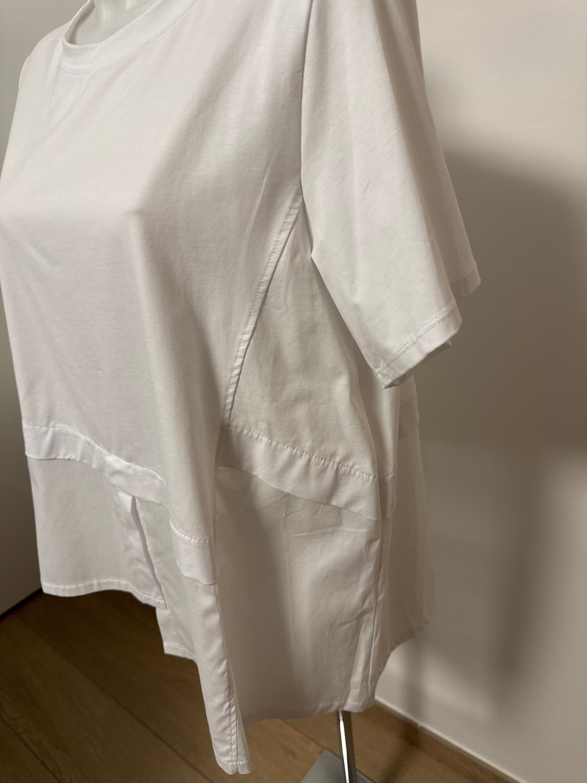Blusa linea 158C Tessuto cotone, doppio filato di cotone che la rende particolare linea leggermente asimmetrica, mezza manica davanti, leggermente più corta sul davanti solo da un piccolo lato .