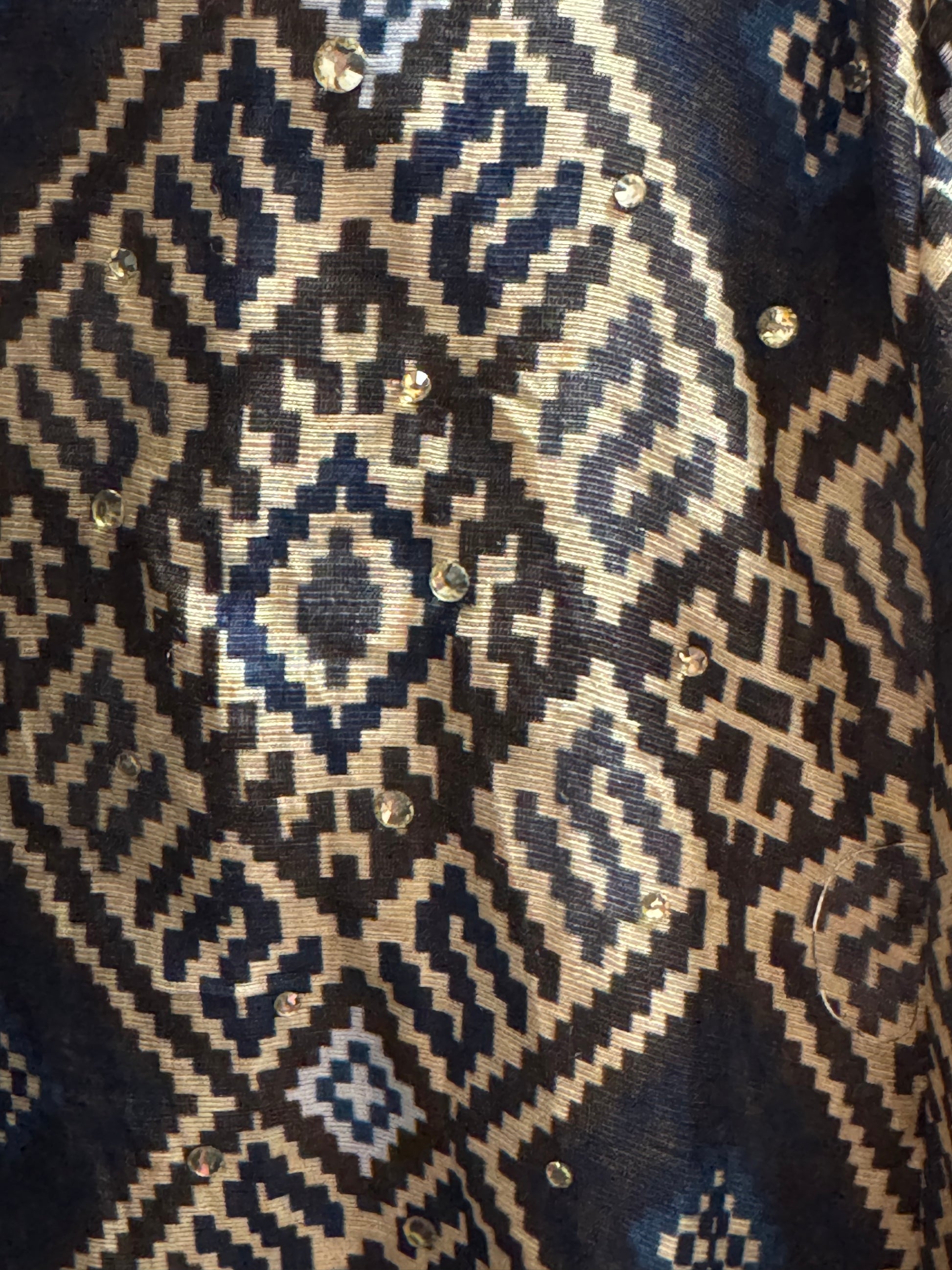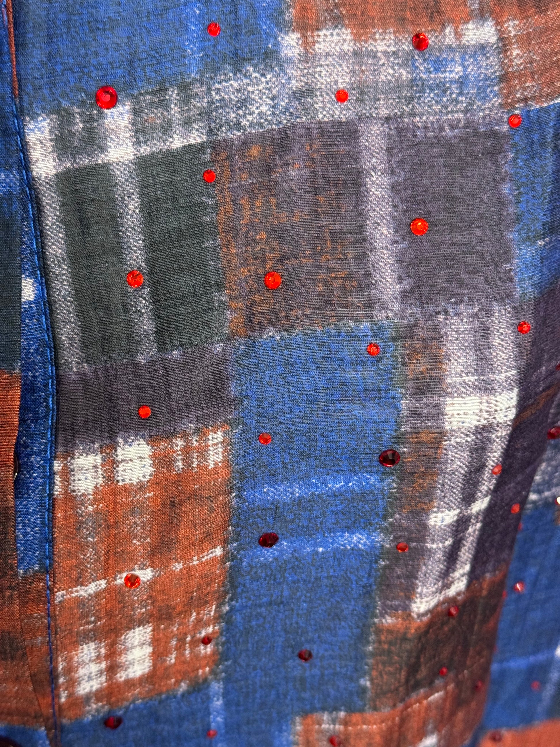I diamanti blu sparsi sulla maglia aggiungono una brillantezza sottile ma sofisticata, mentre la stampa fantasia dona un tocco di originalità.