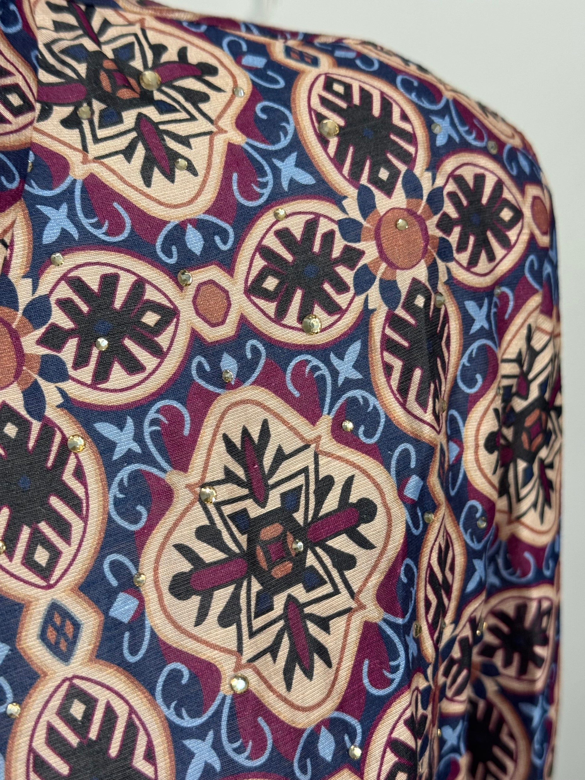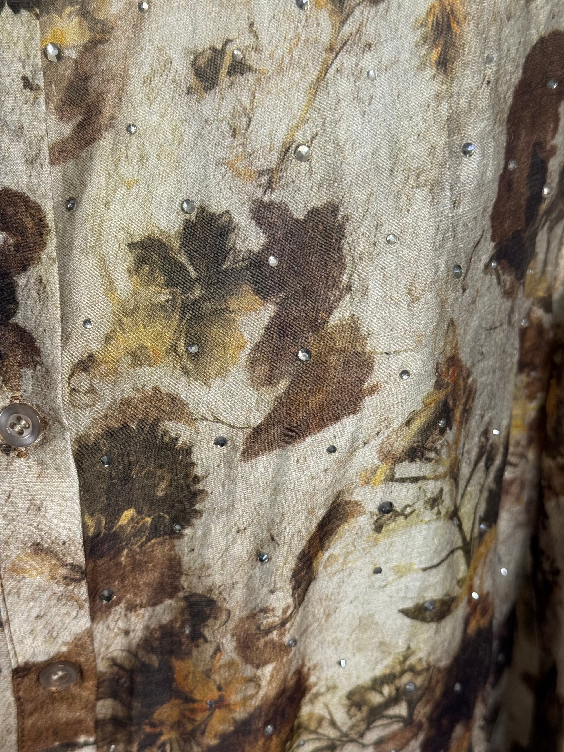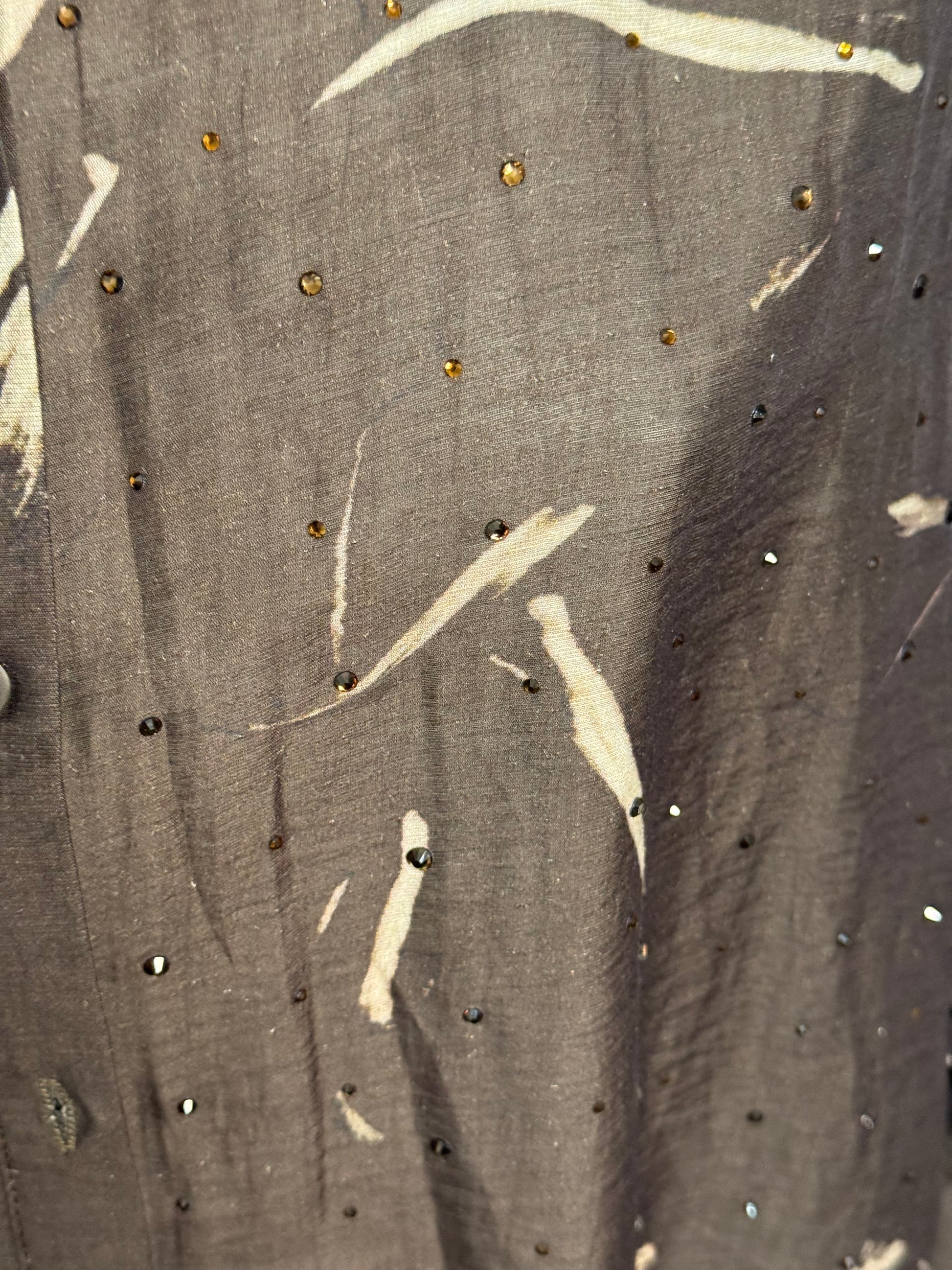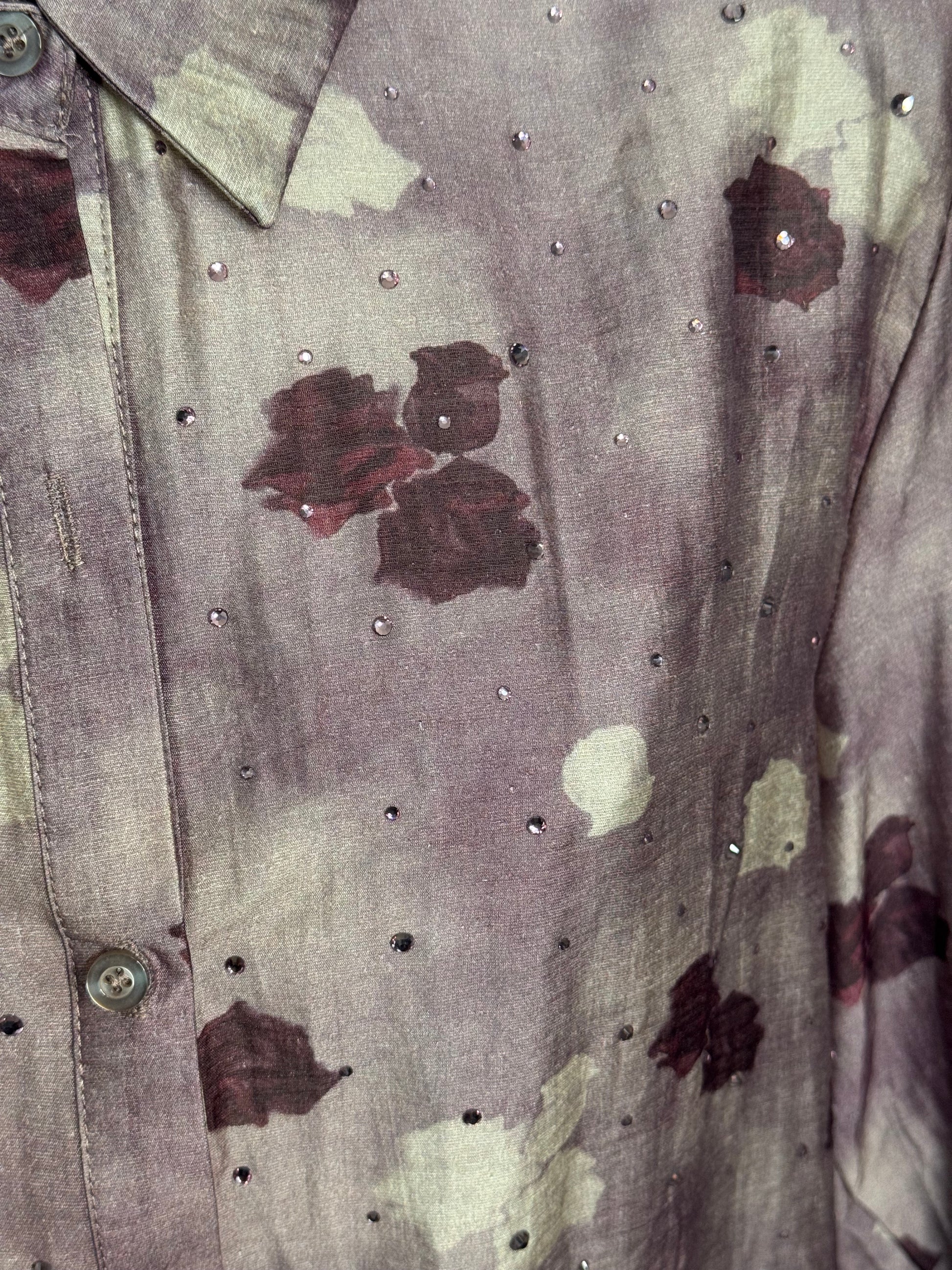 Questa camicia fantasia con stampa e strass della marca VICBEE è perfetta per un tocco di eleganza e creatività.
