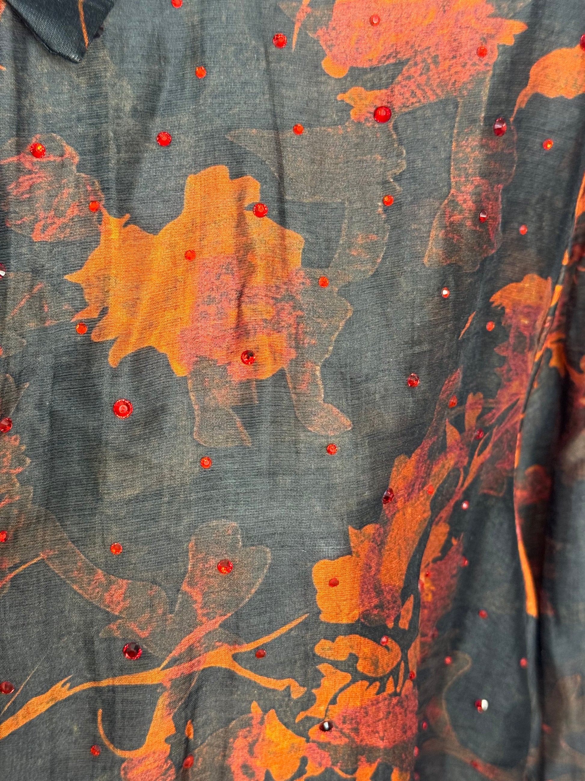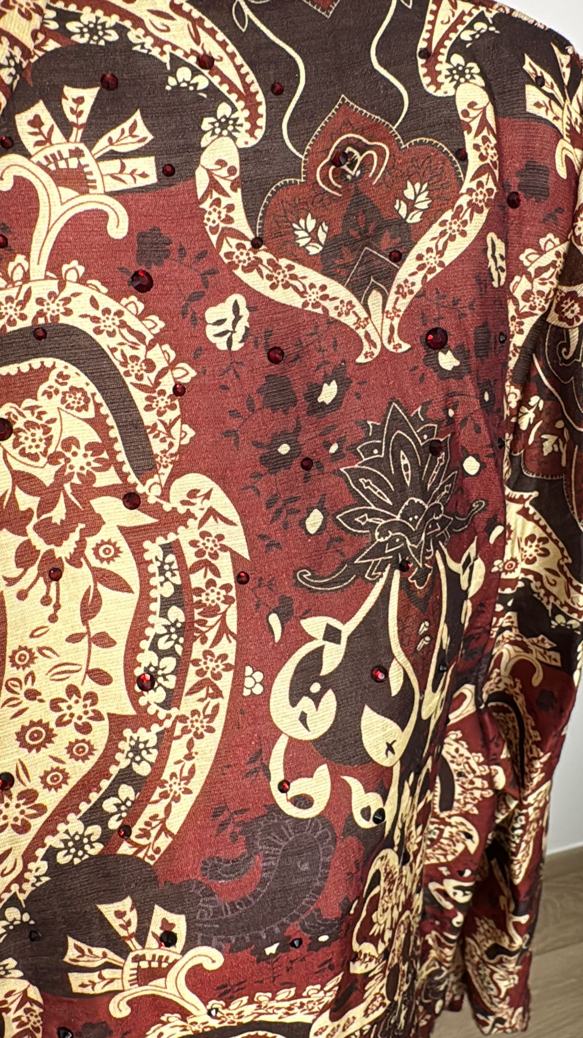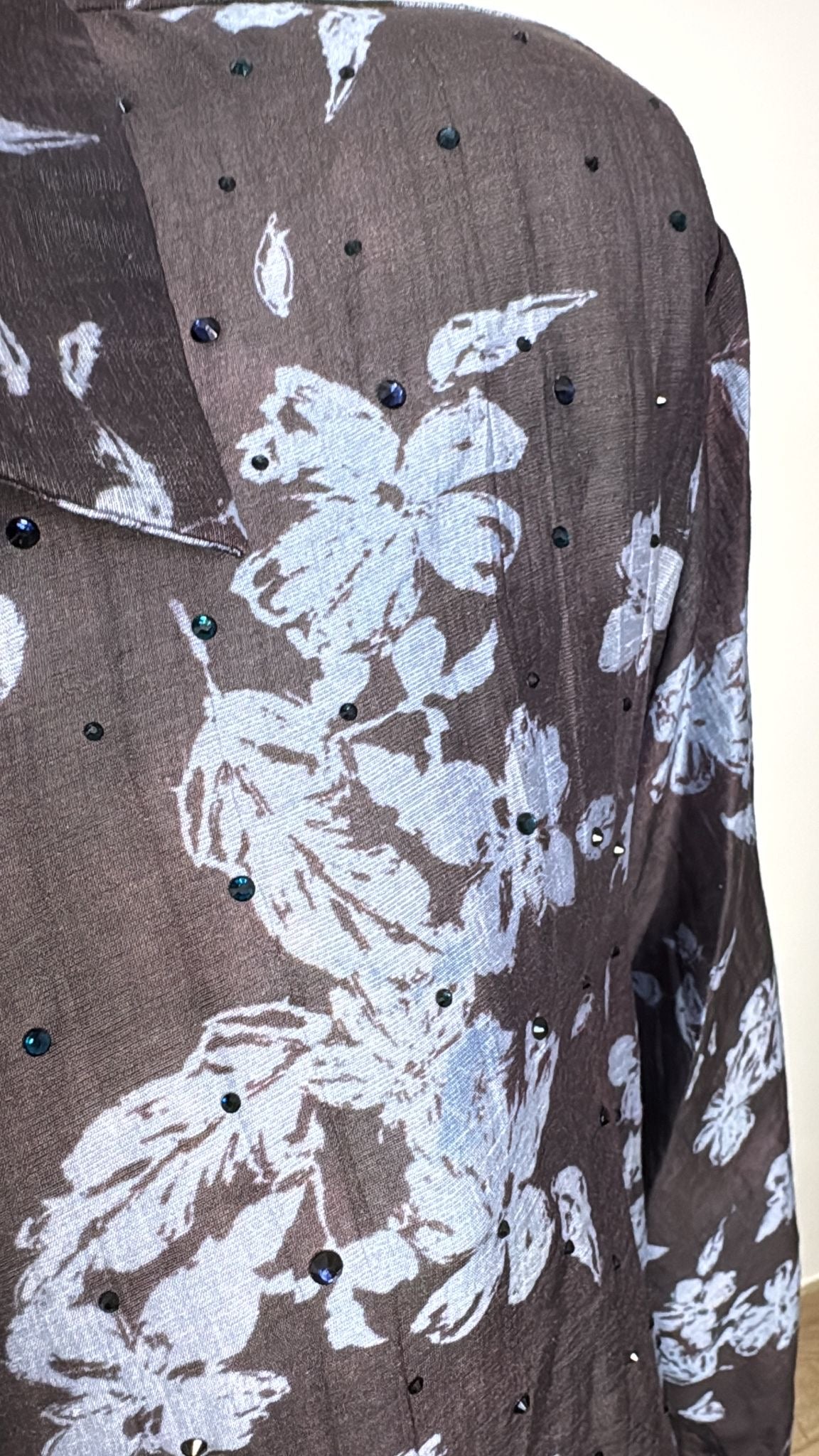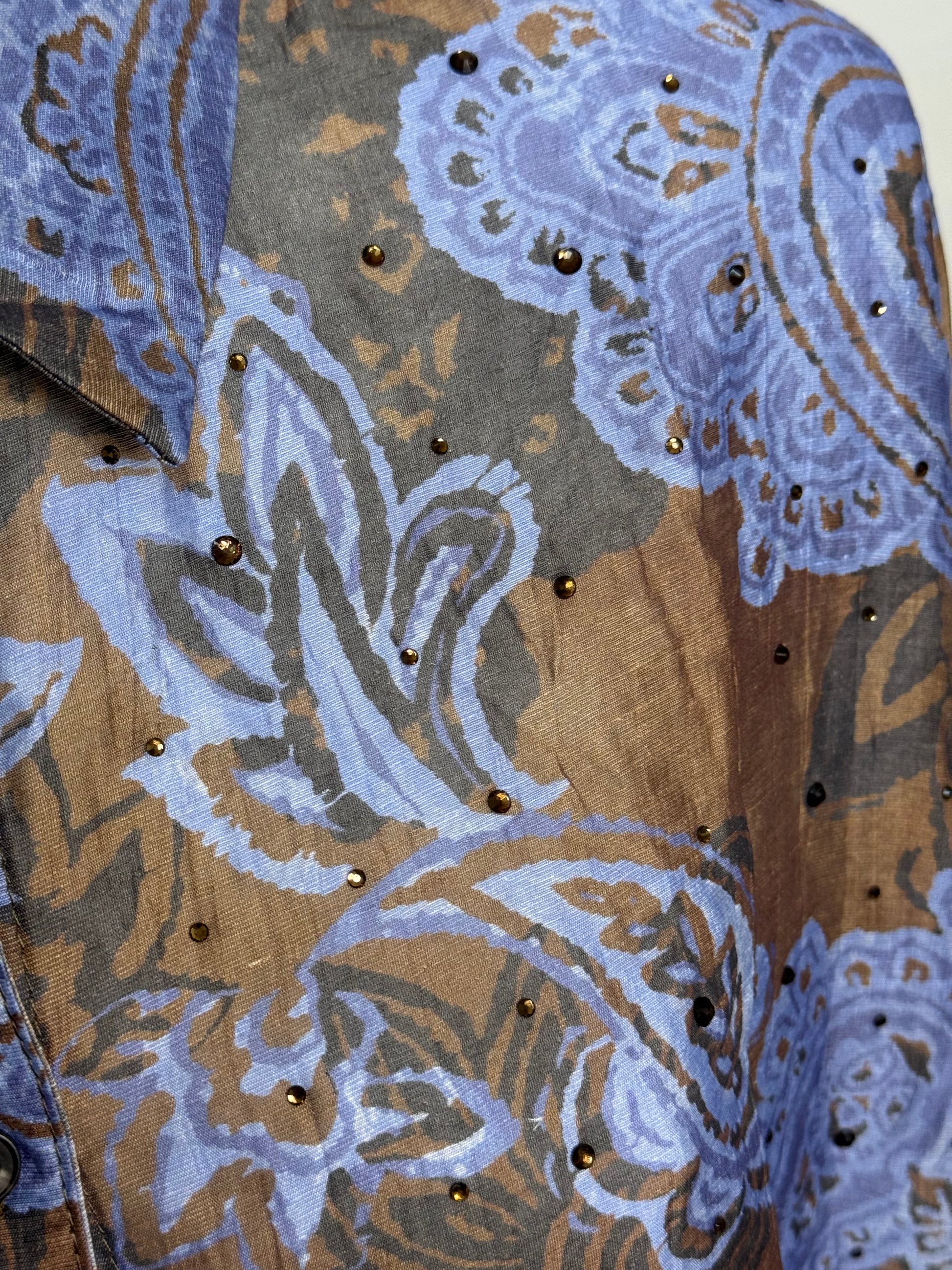 Questa camicia fantasia con stampa e strass della marca VICBEE è perfetta per un tocco di eleganza e creatività.