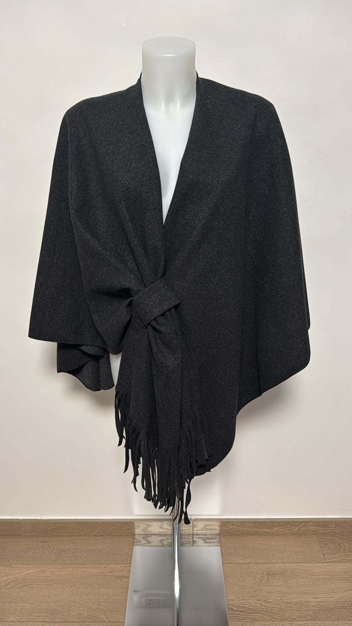 Cappa in panno regolabile sul davanti tramite una sorta di asola che diventa anche un elemento di abbellimento . Frange sul davanti per arricchire il tutto.