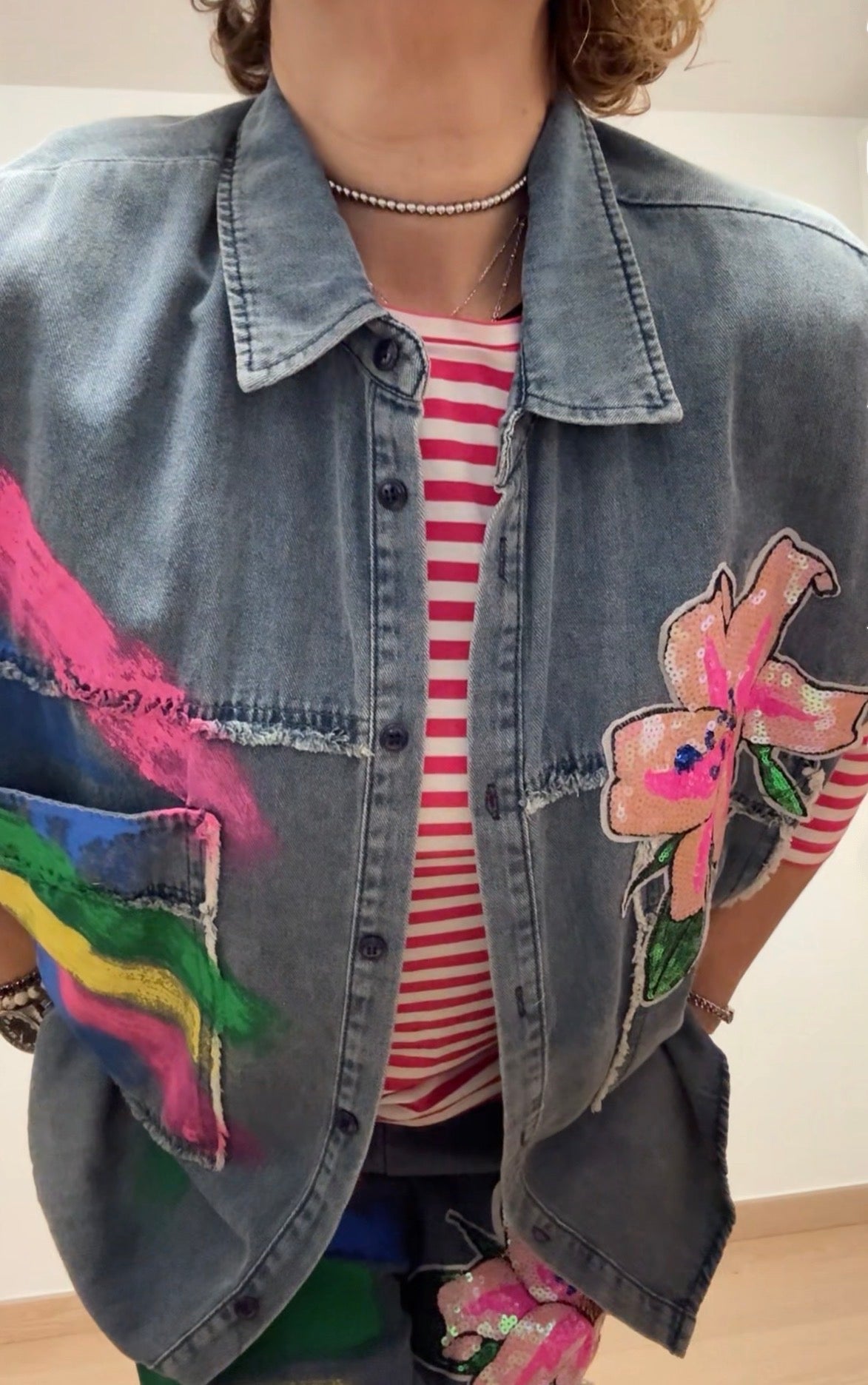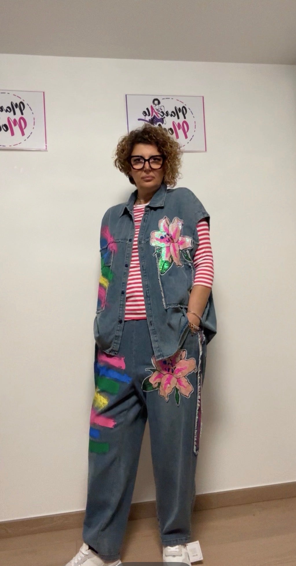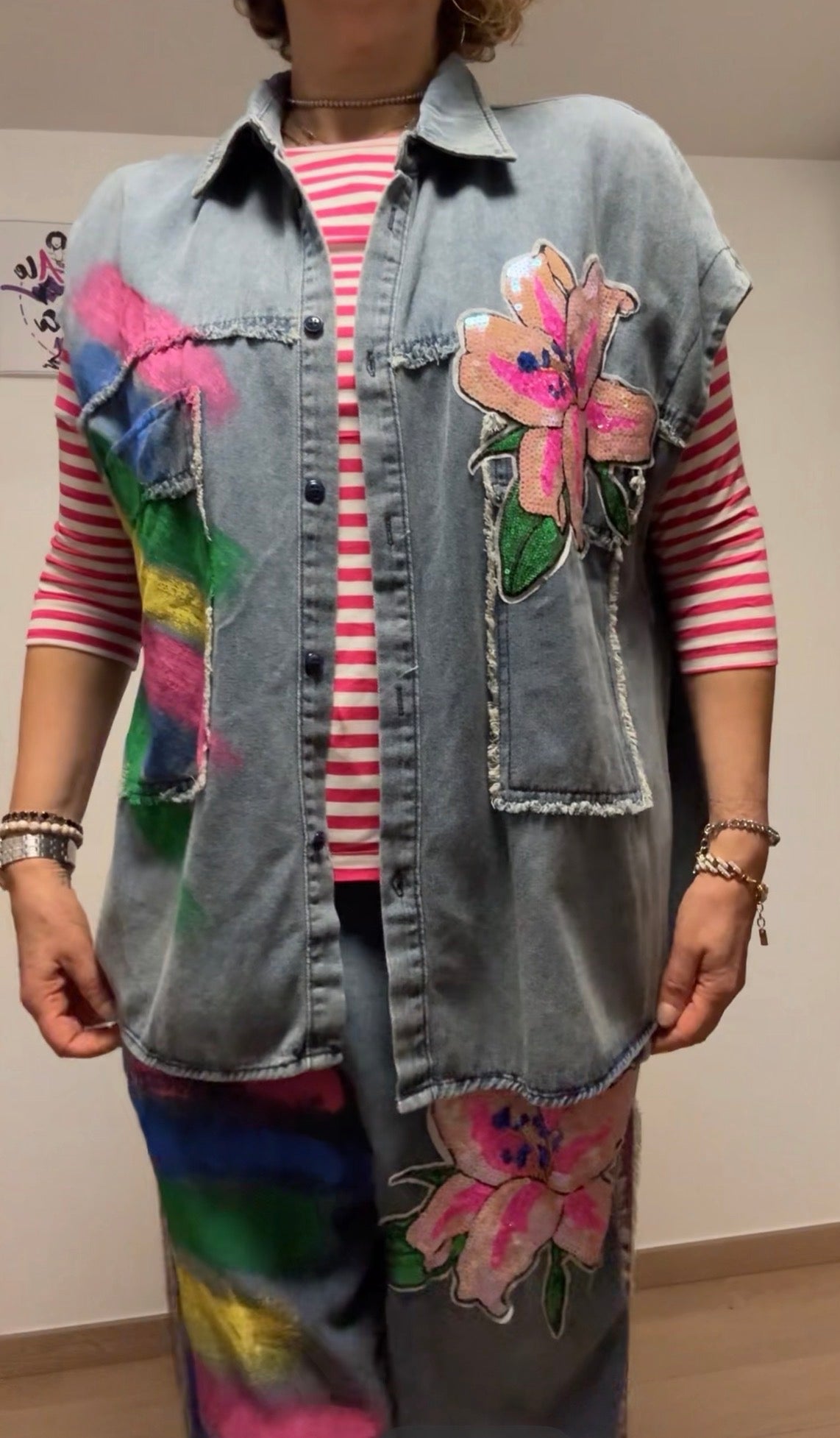 Coordinato brand FLY , tessuto cotone leggerissimo, dipinto a mano, paillettes, un’esplosione di colori .
