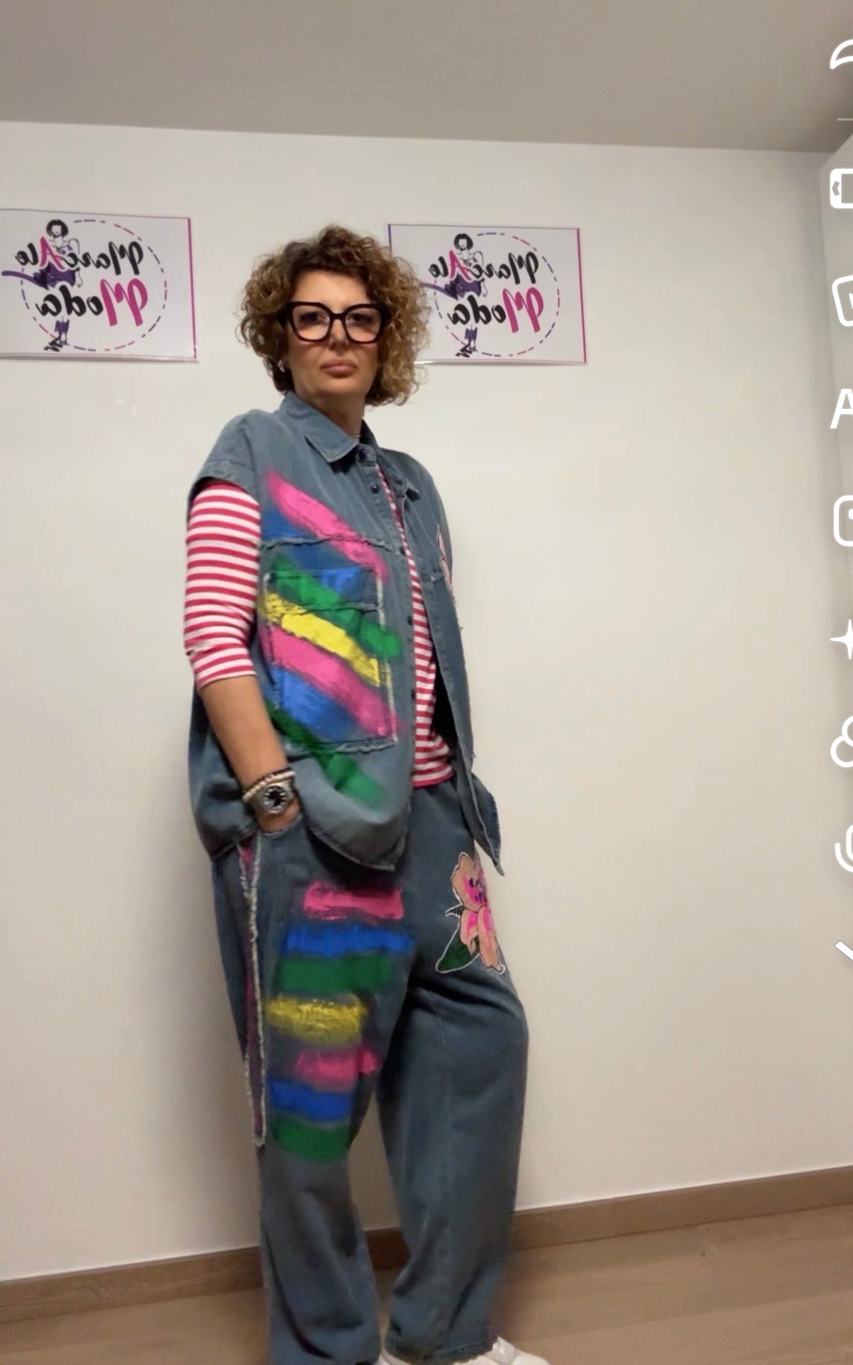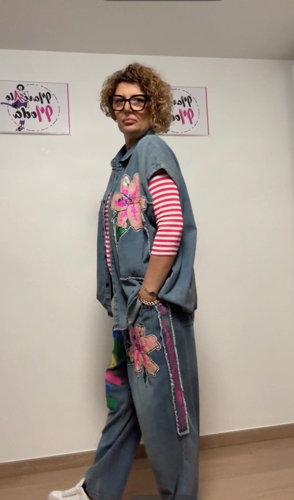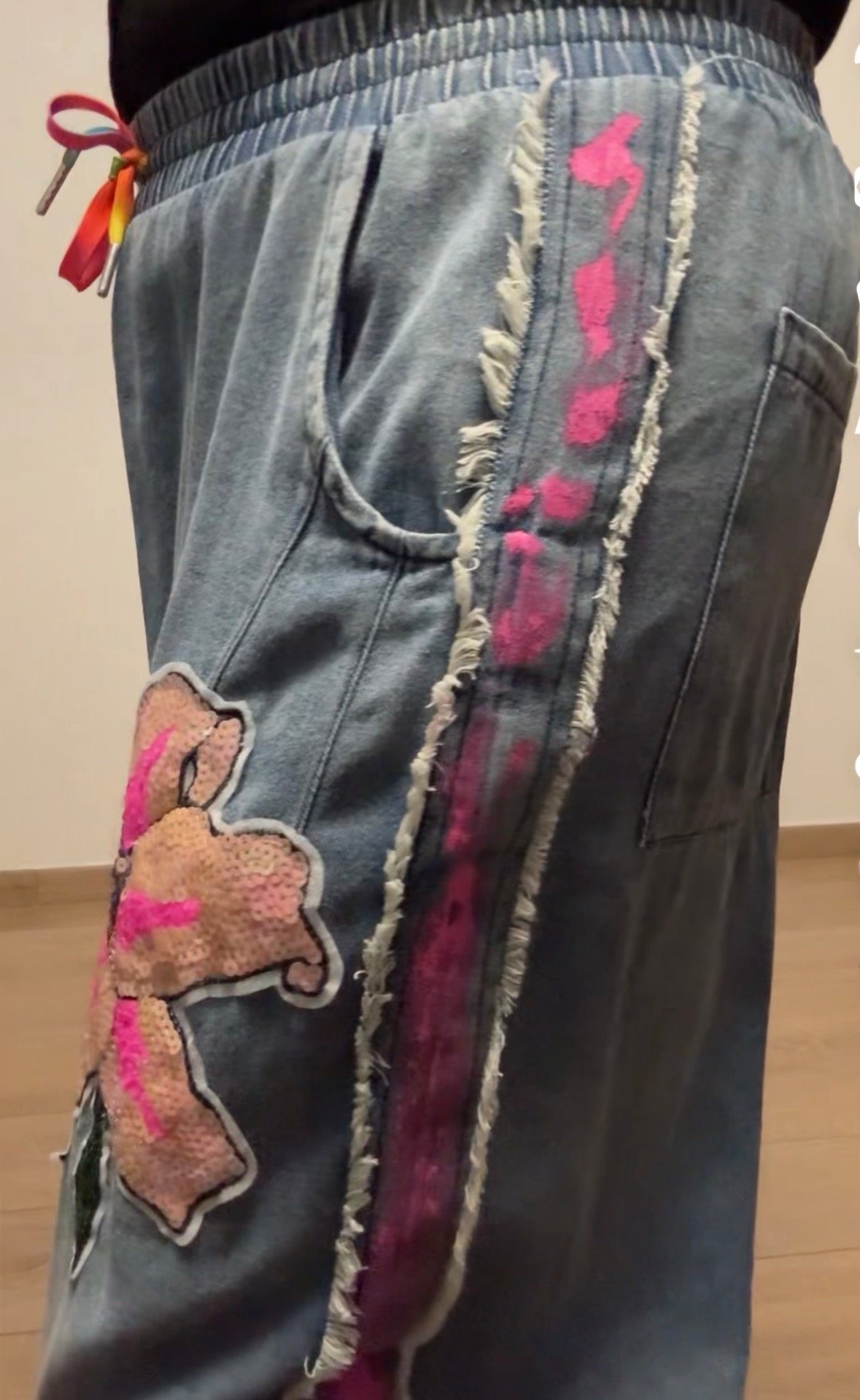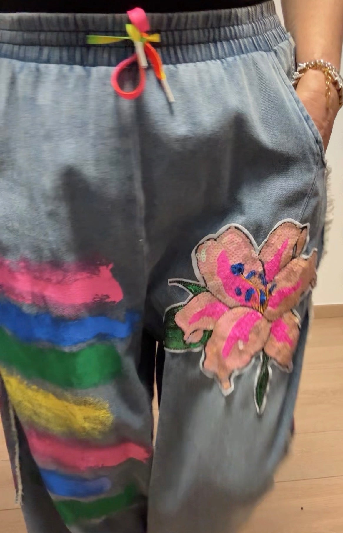 Coordinato brand FLY , tessuto cotone leggerissimo, dipinto a mano, paillettes, un’esplosione di colori .