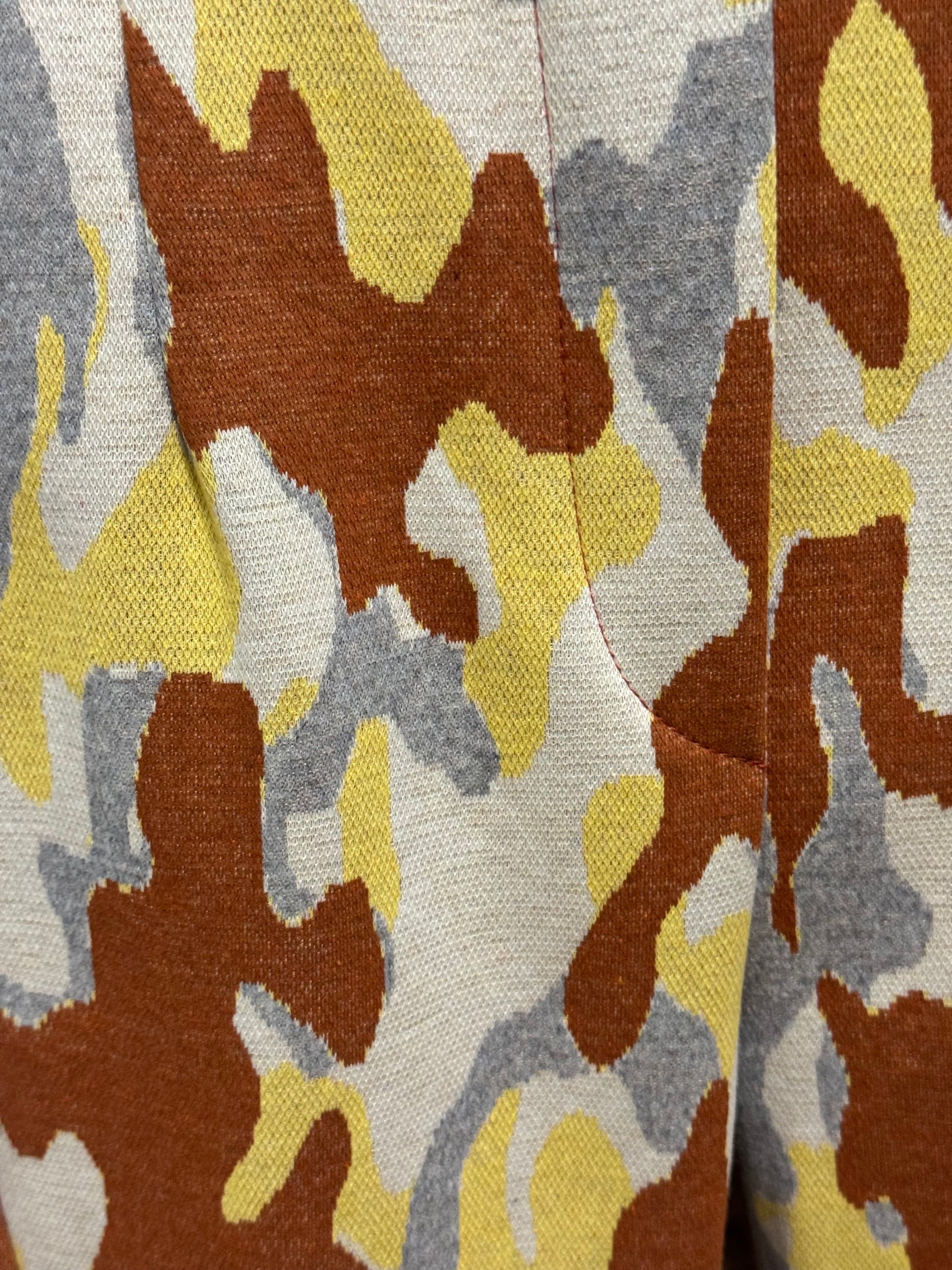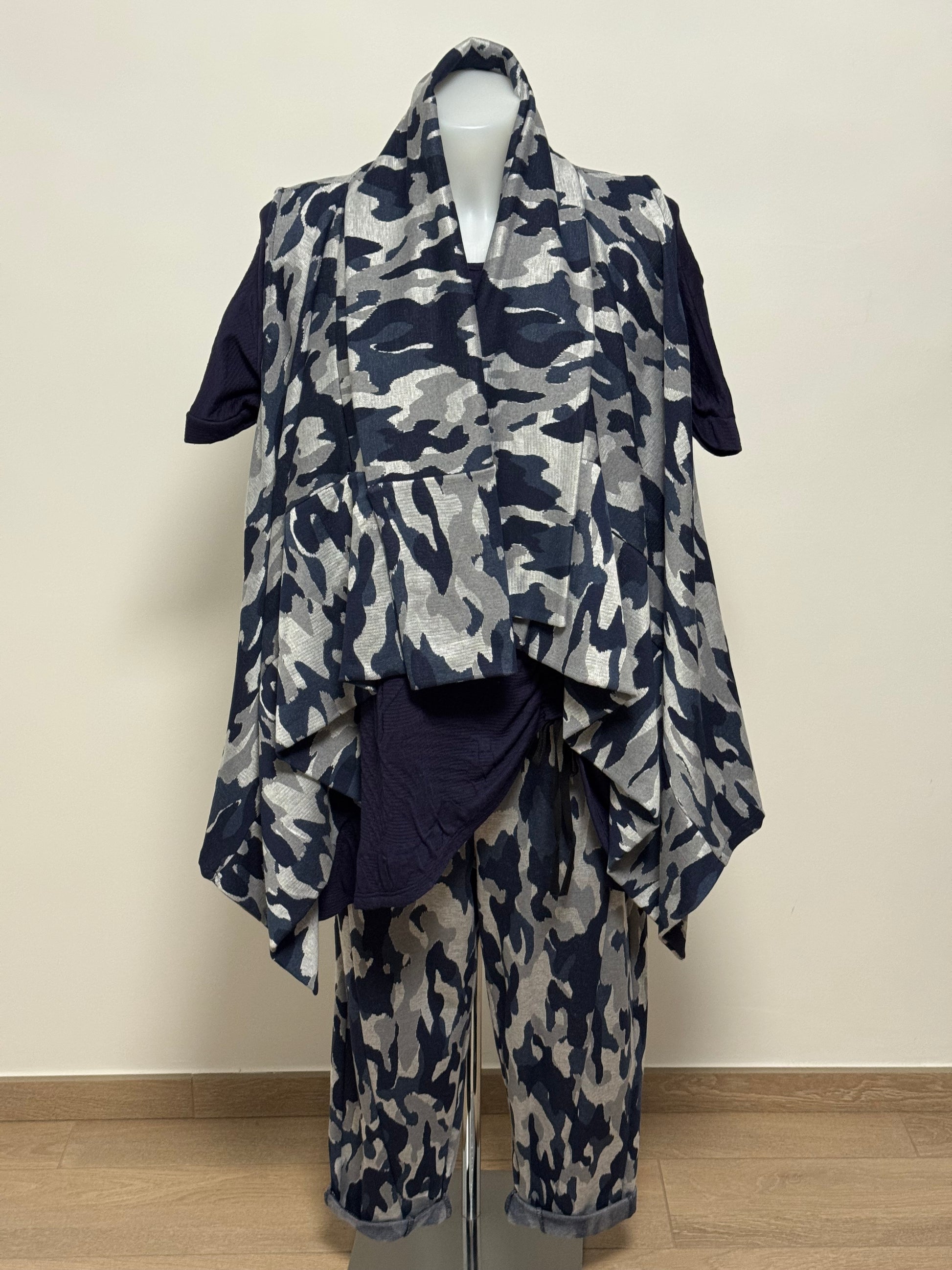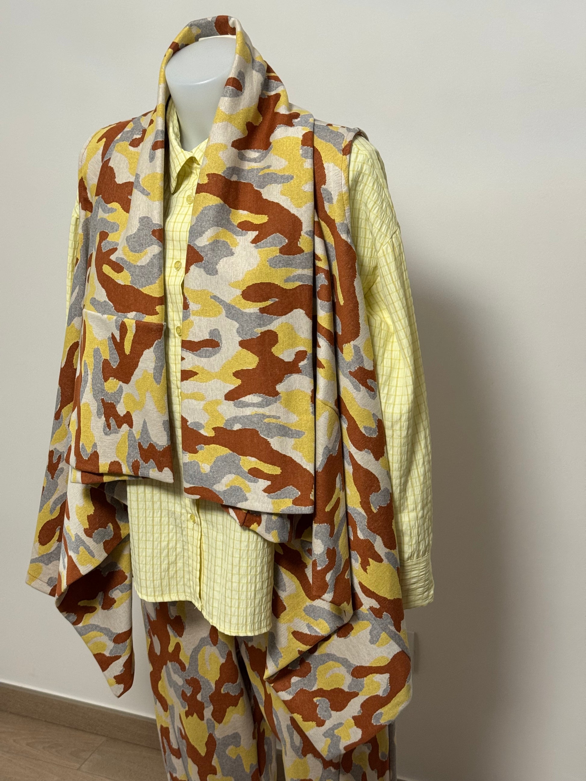 Coordinato brand Sun Sun filato disegno camuflage in due varianti colore. Gilet asimmetrico e pantalone linea dritta con particolarità del taglio che va a finire davanti in fondo alla caviglia . Elastico in vita . Tessuto elastico .