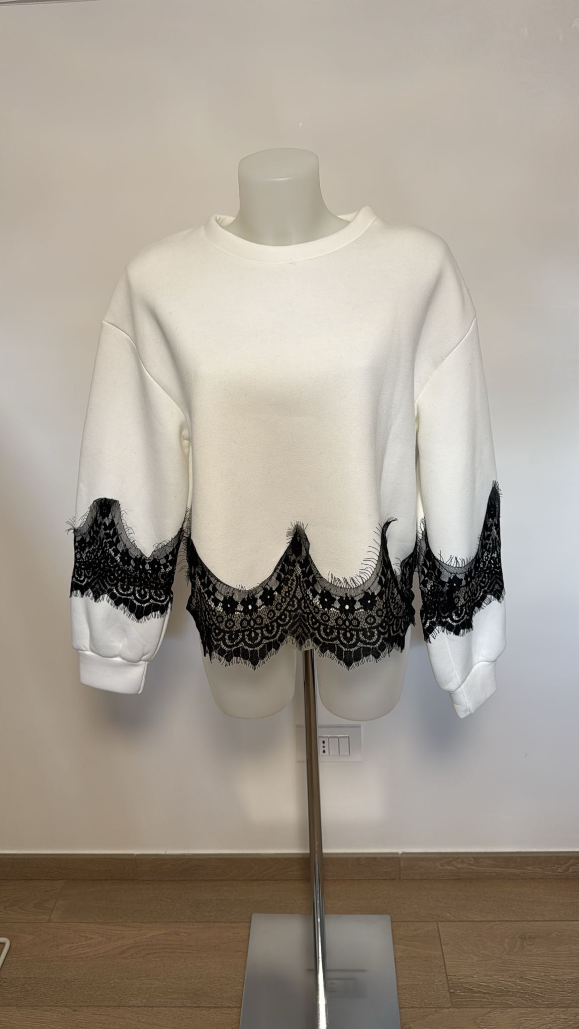 Felpa con abbellimento del pizzo a contrasto sia sulle maniche che come greca tutto intorno nella parte finale del busto.