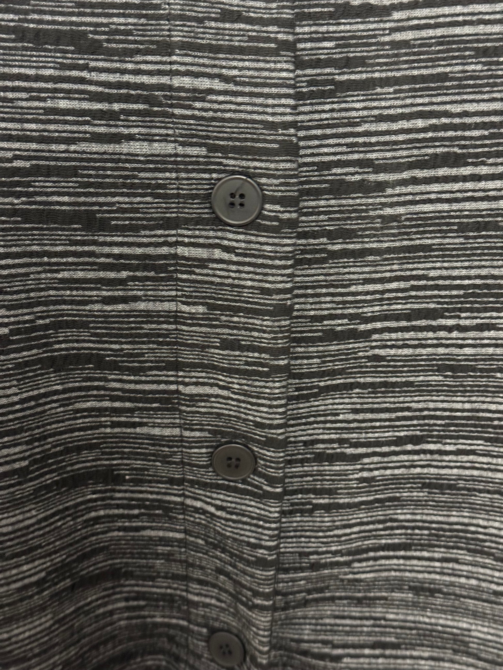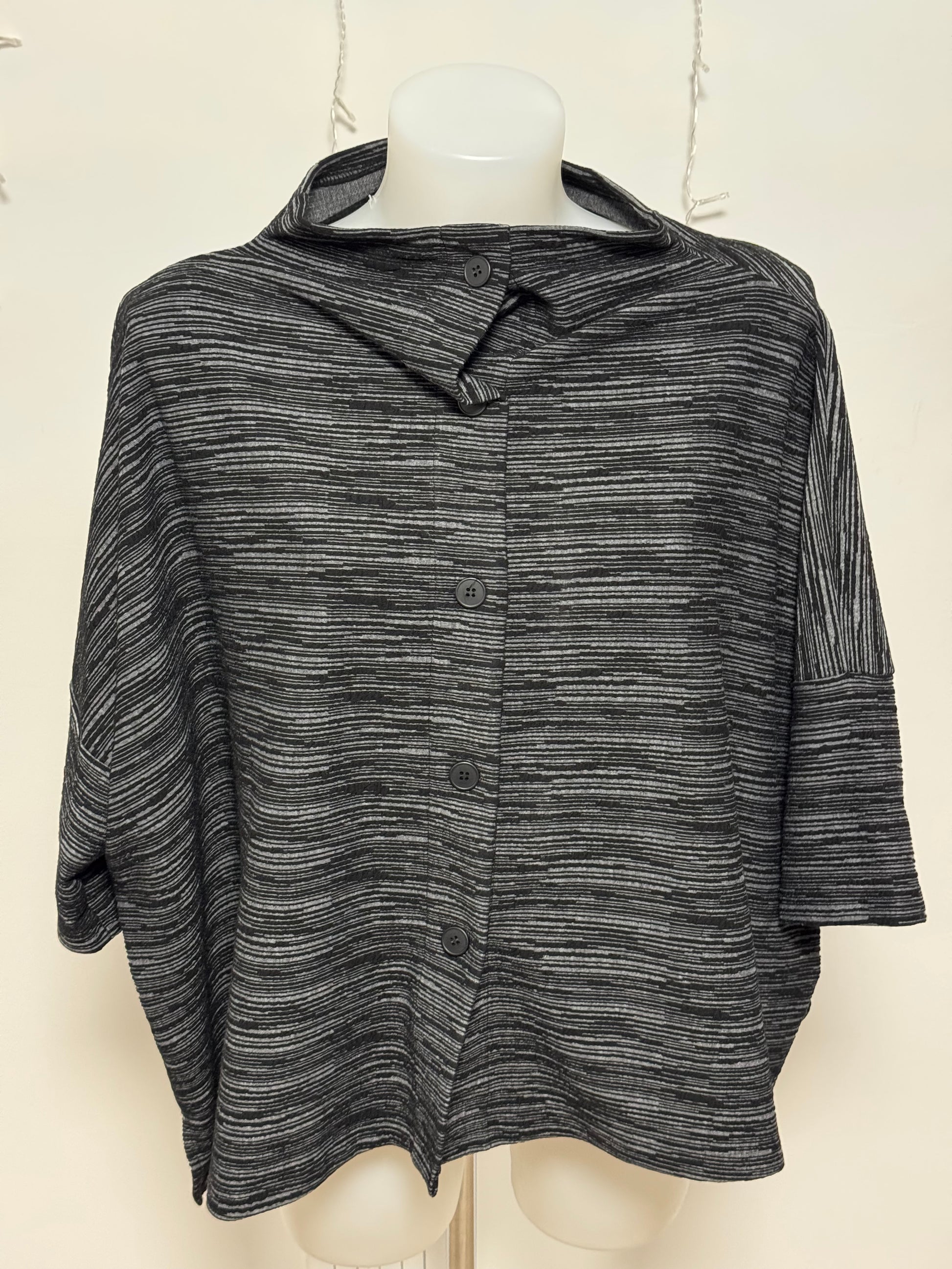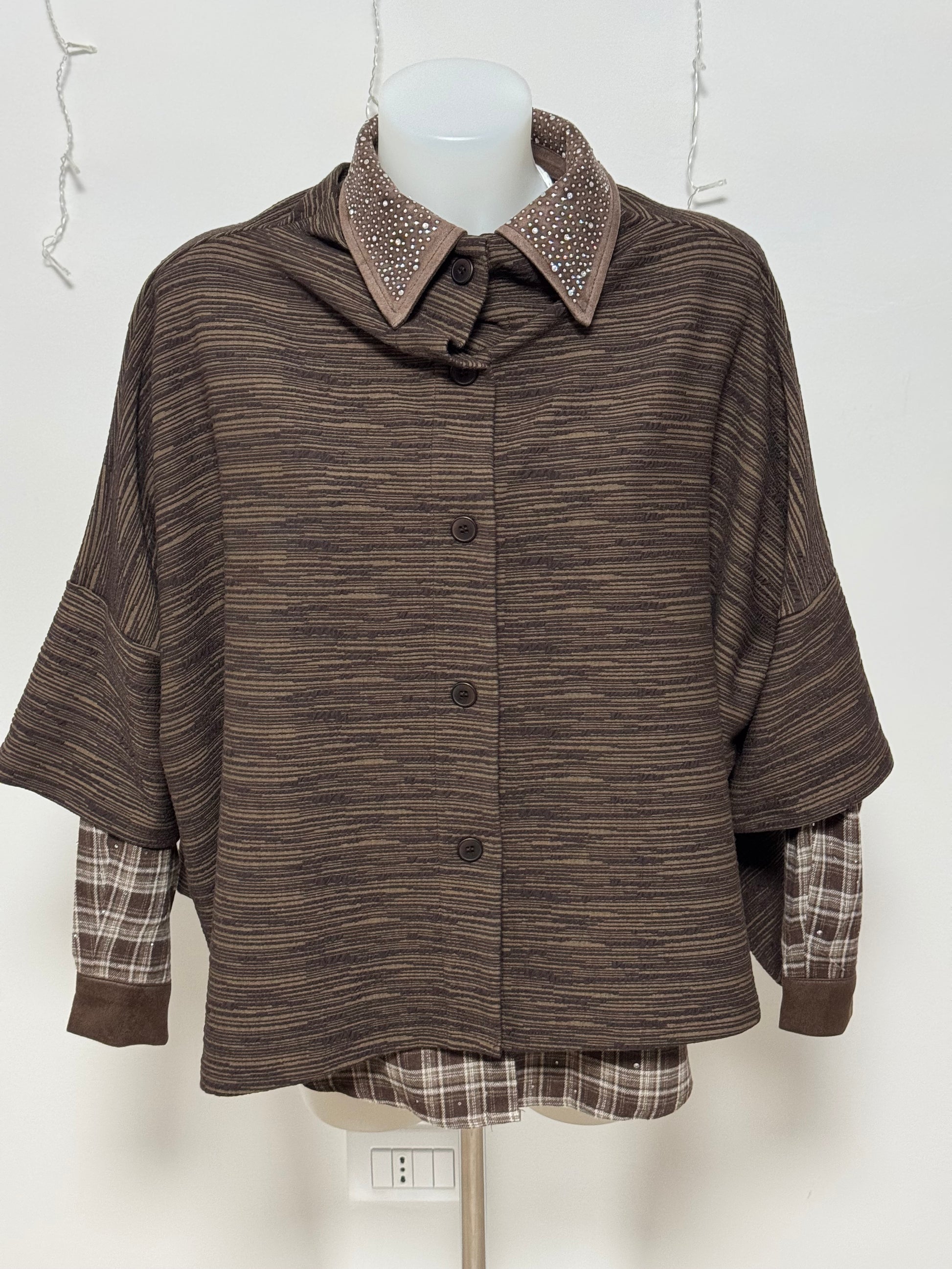 Casacca rigata sfumatura tono colore effetto filato fiammato , in rilievo. Allacciatura davanti con bottoni. Brand linea 158C . Taglio scatola.