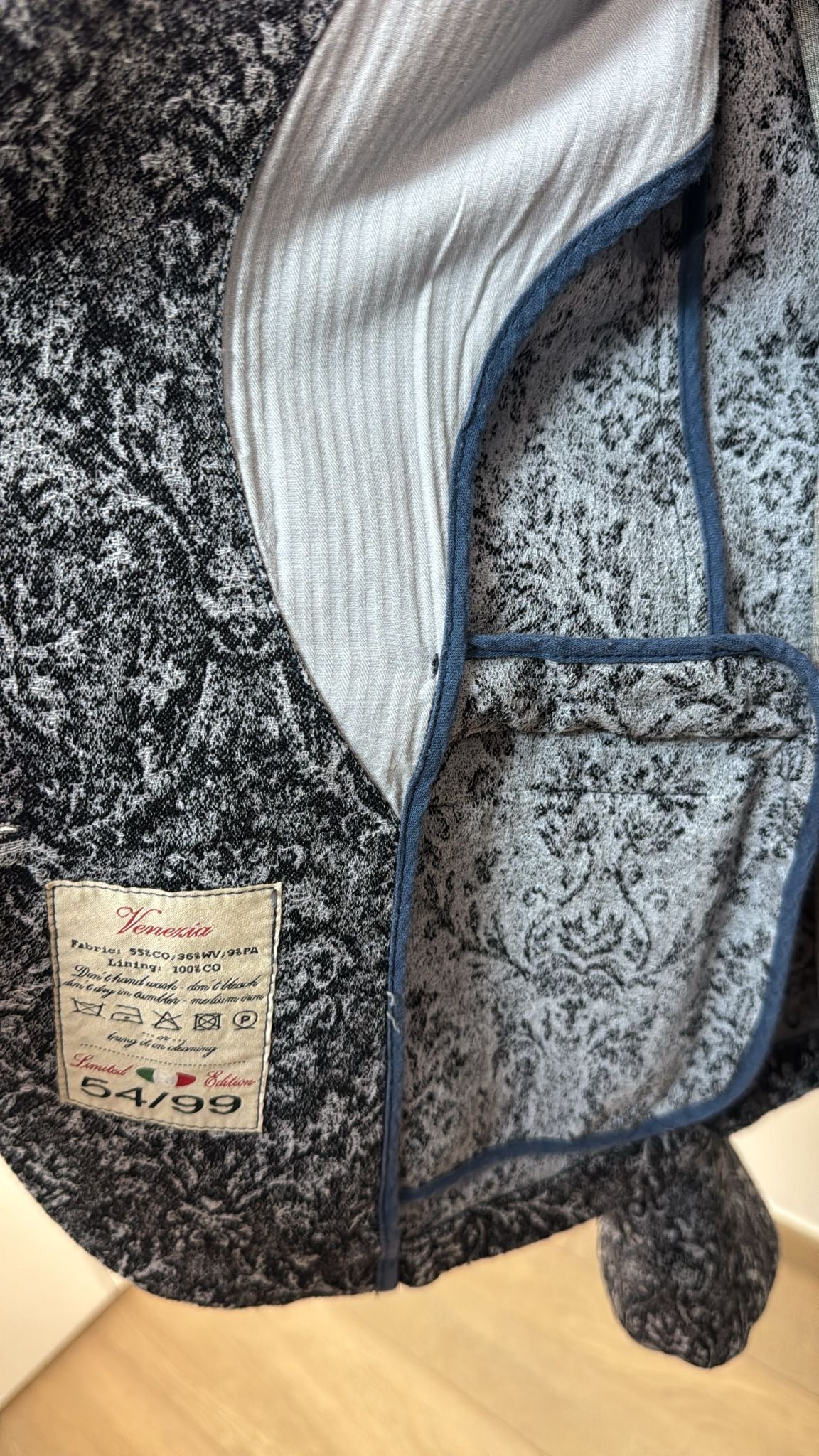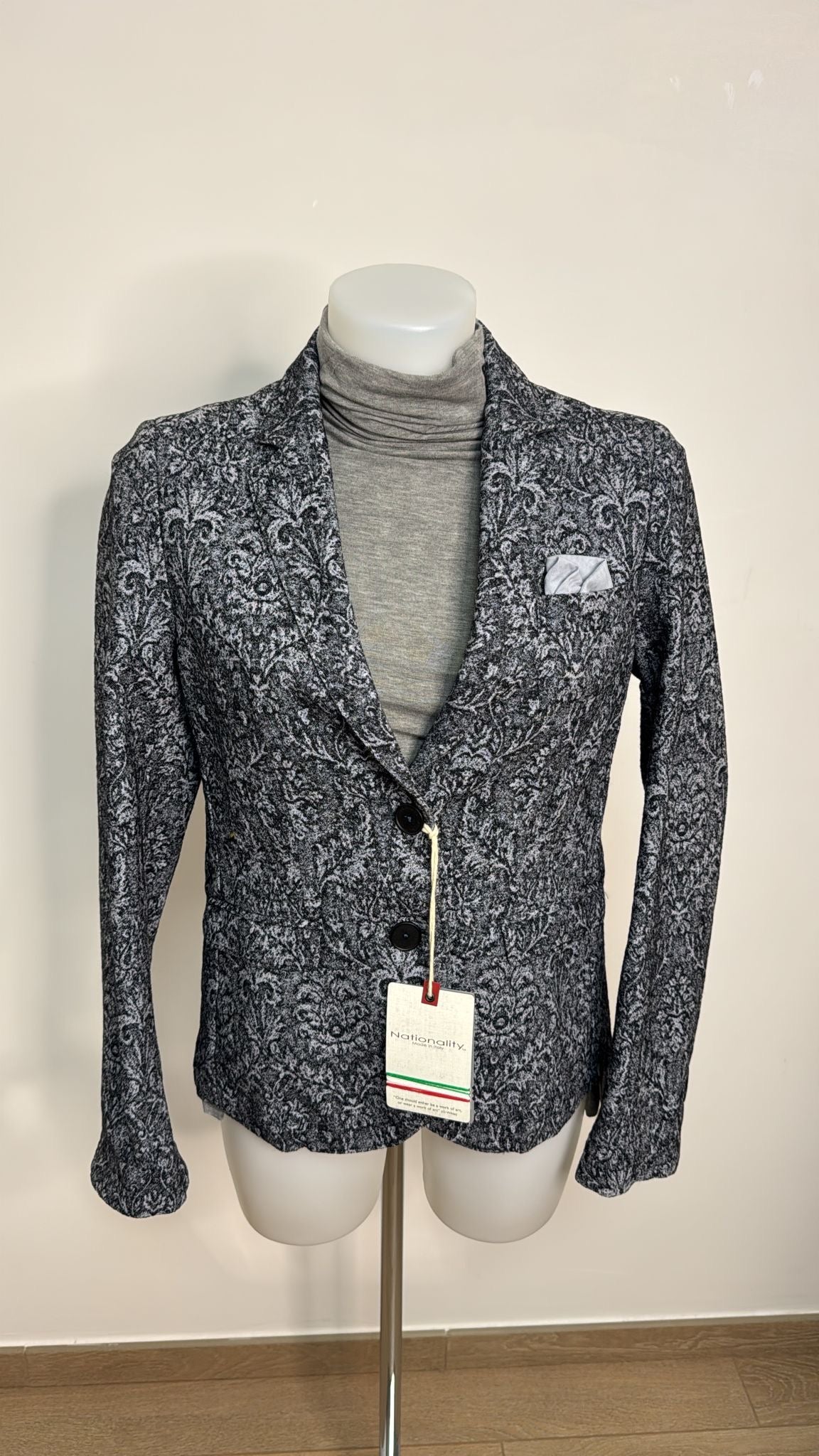 Giacca con un elegante tessuto ricamato e allacciatura a doppio bottone.