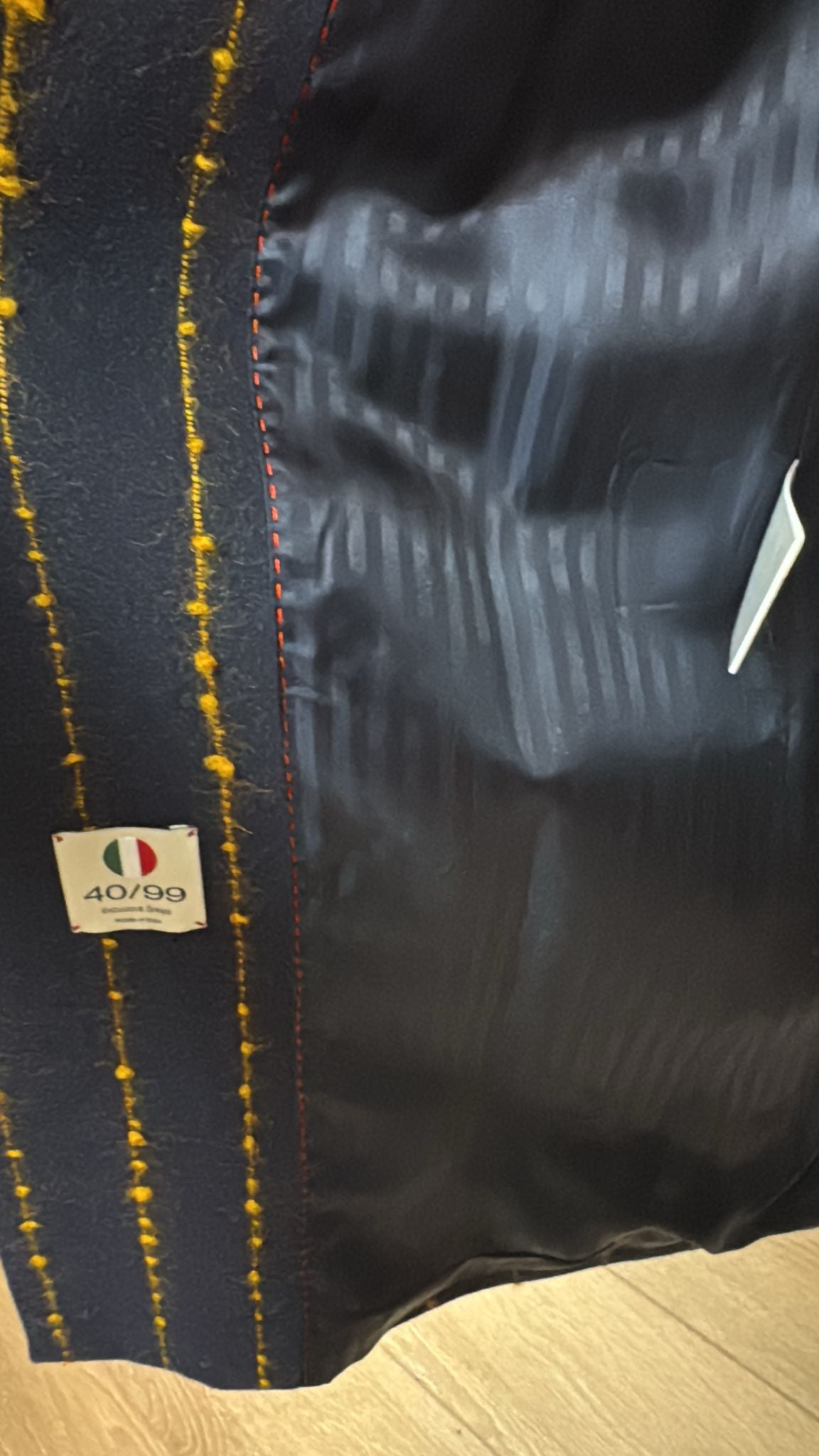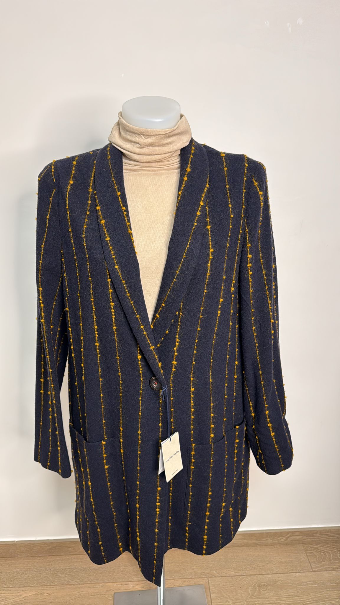 La nostra giacca gessata blu con filato giallo in rilievo è un mix di eleganza e originalità. La fodera interna e la doppia tasca la rendono pratica e comoda. Realizzata con bottoni e un raffinato effetto irregolare, è il perfetto mix tra stile e funzionalità.