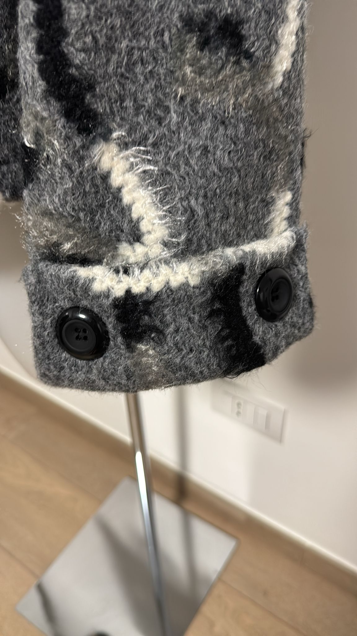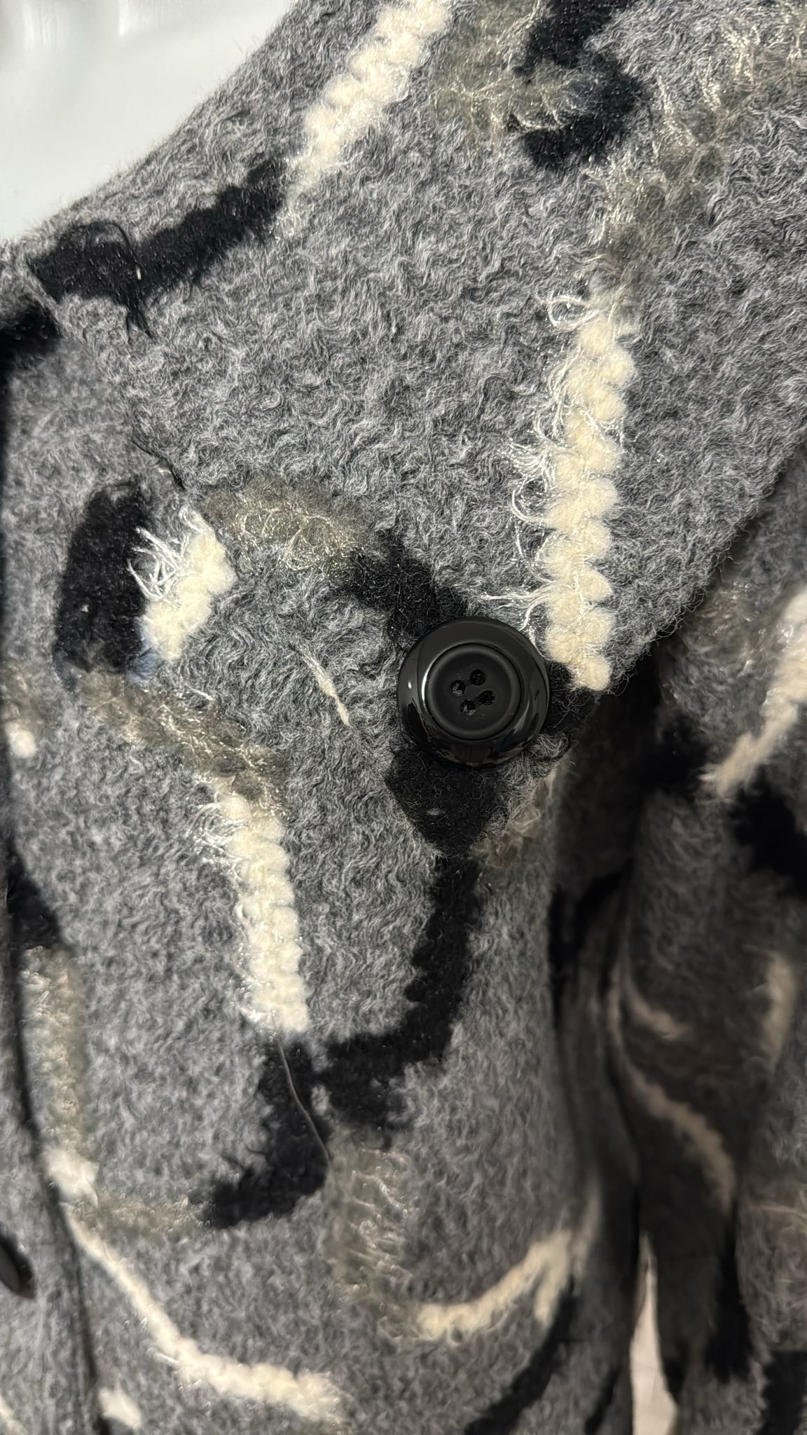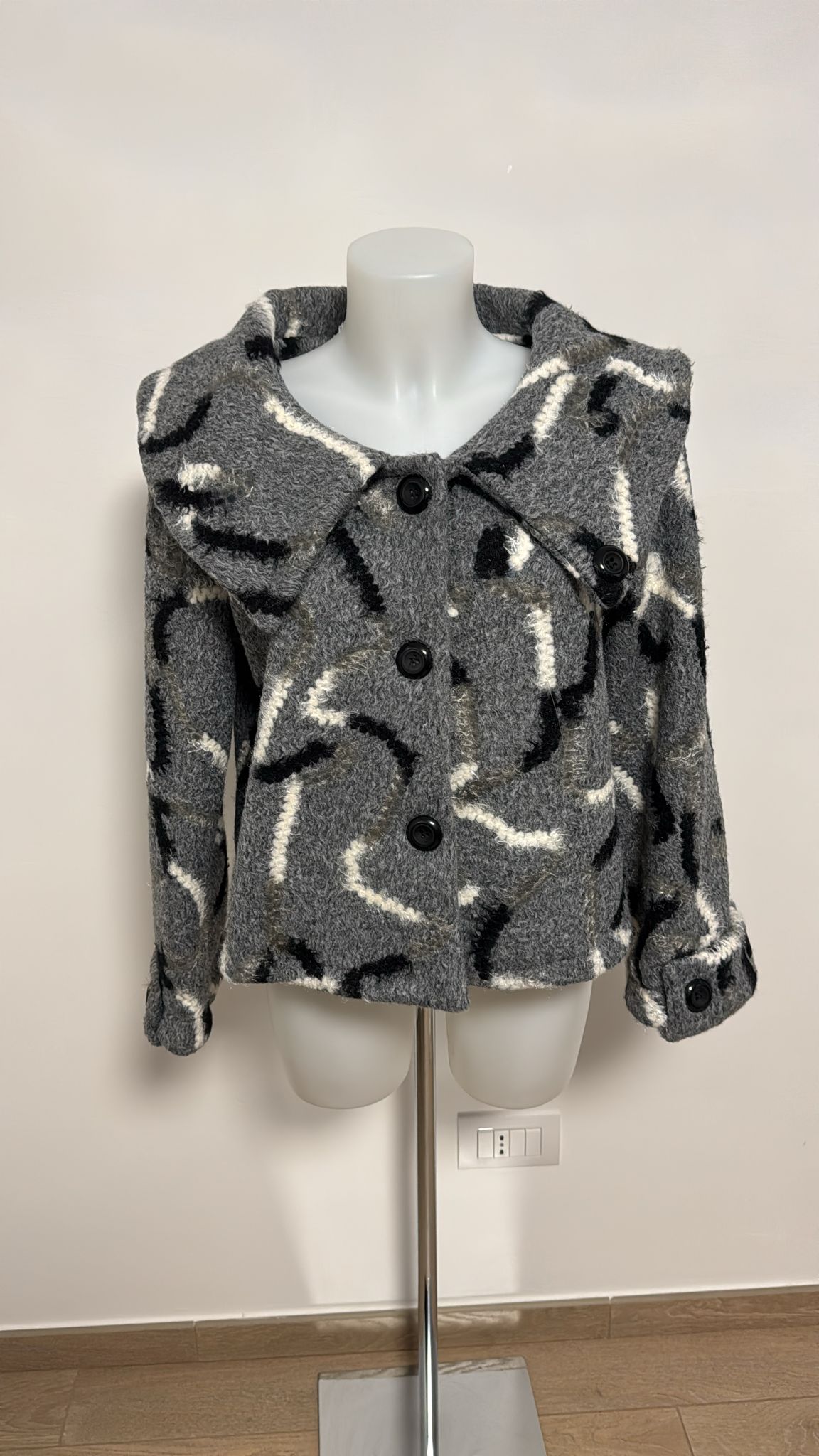 Giacca in lana con chiusura bottoni , bottone abbellimento collo e risvolto maniche, tessuto lavorato con effetto colore burro, grigio e nero.