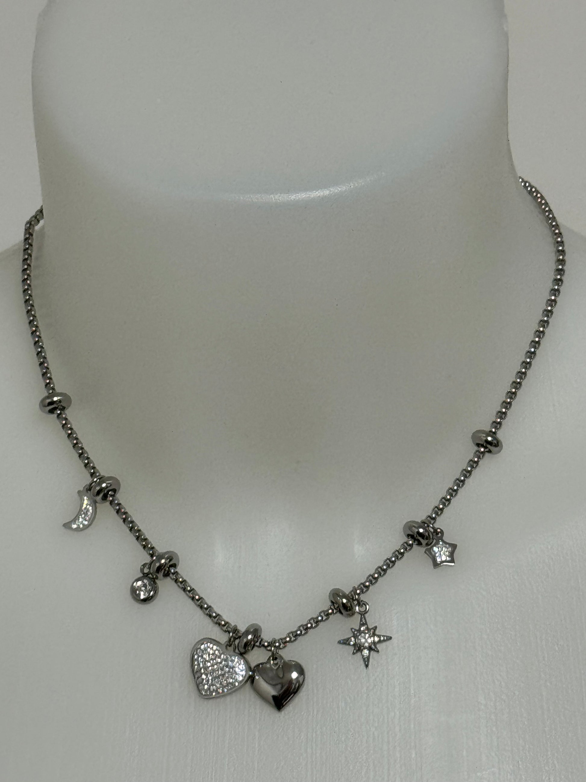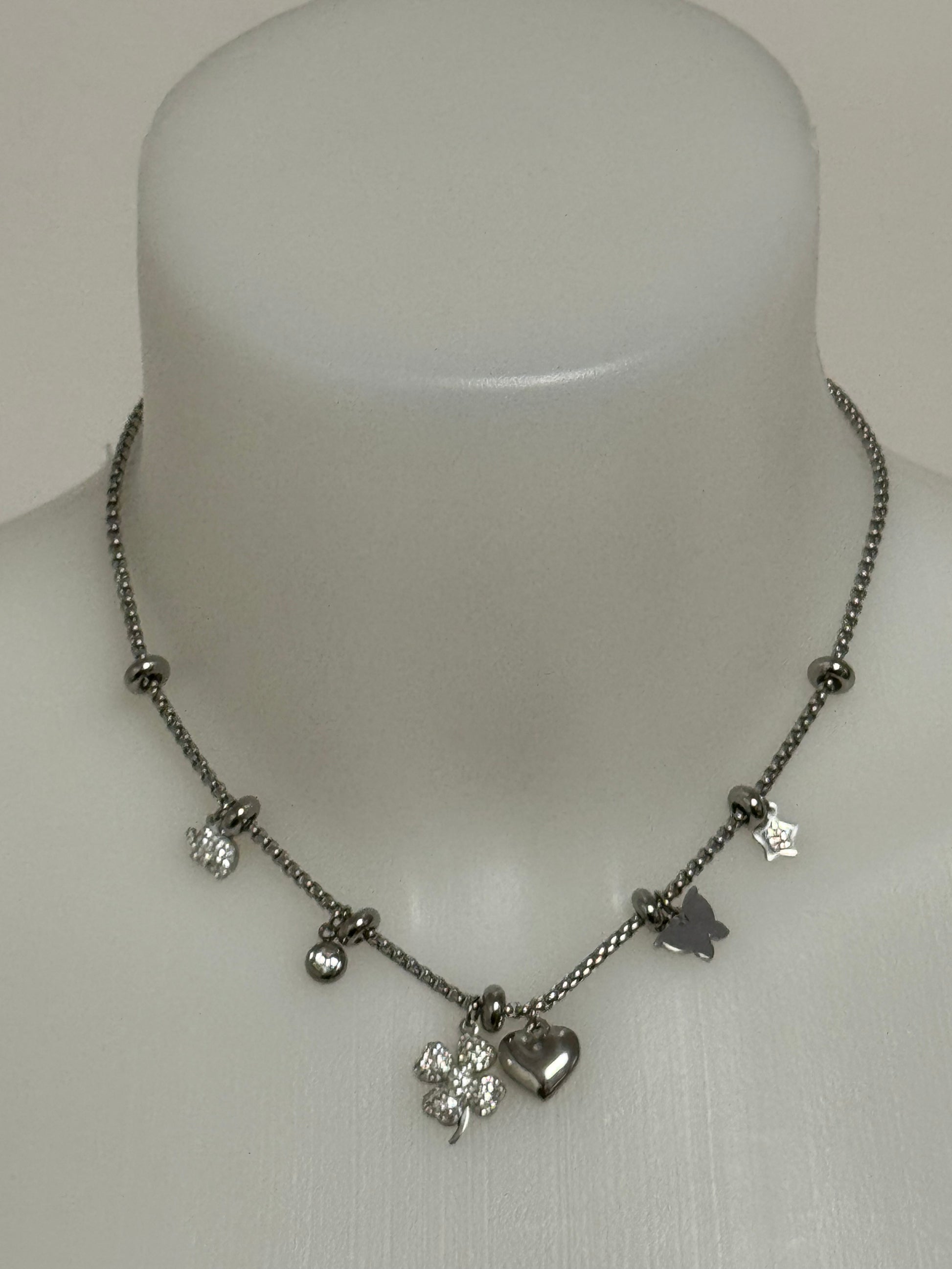 Collanina girocollo con charms tutti diversi in base al dominante centrale di ogniuna. Tutte in acciaio anallergico, immutabile nel tempo.