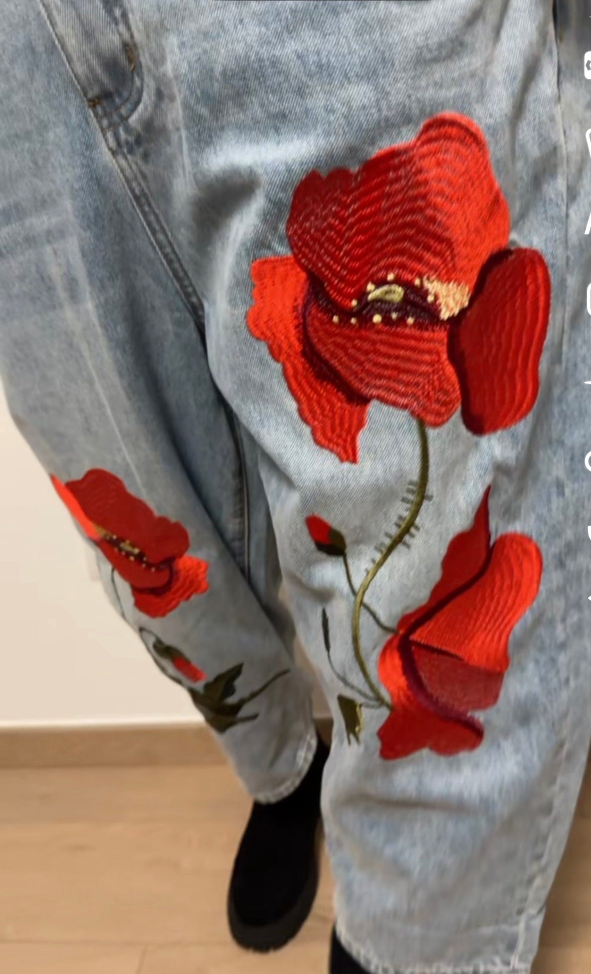 Jeans brand Wendy Trendy con tutto il ricamo tema floreale rosso. Vestibilita’ 42-48