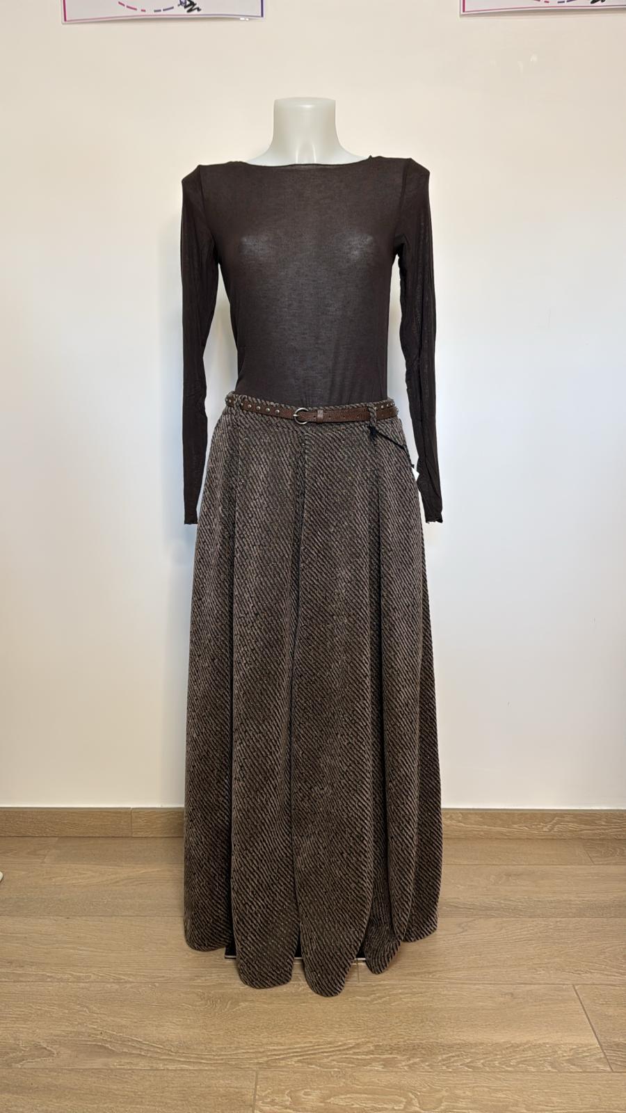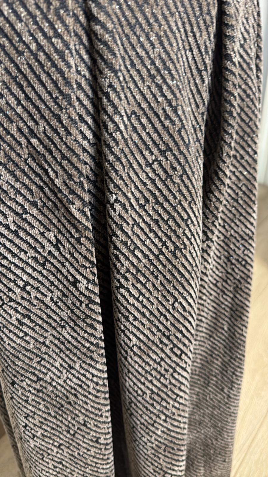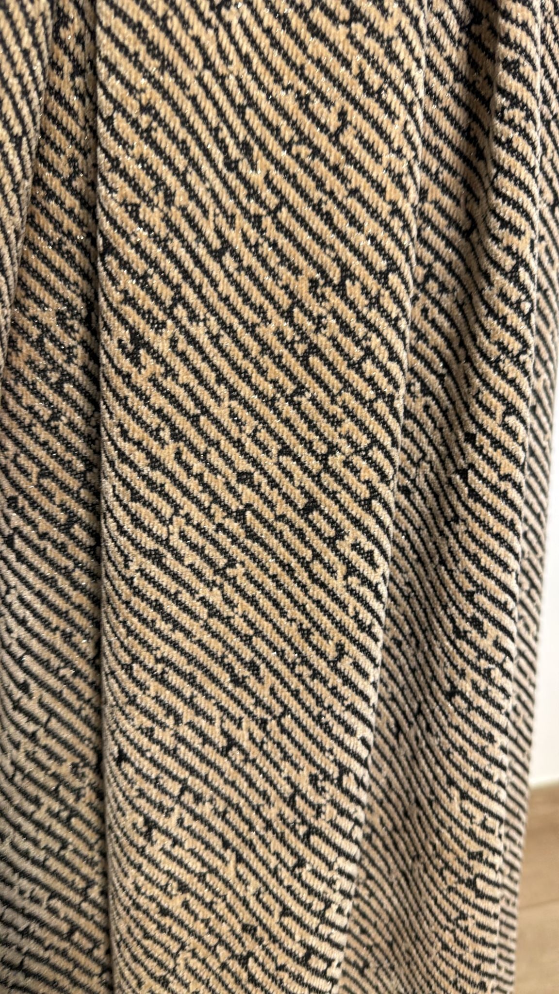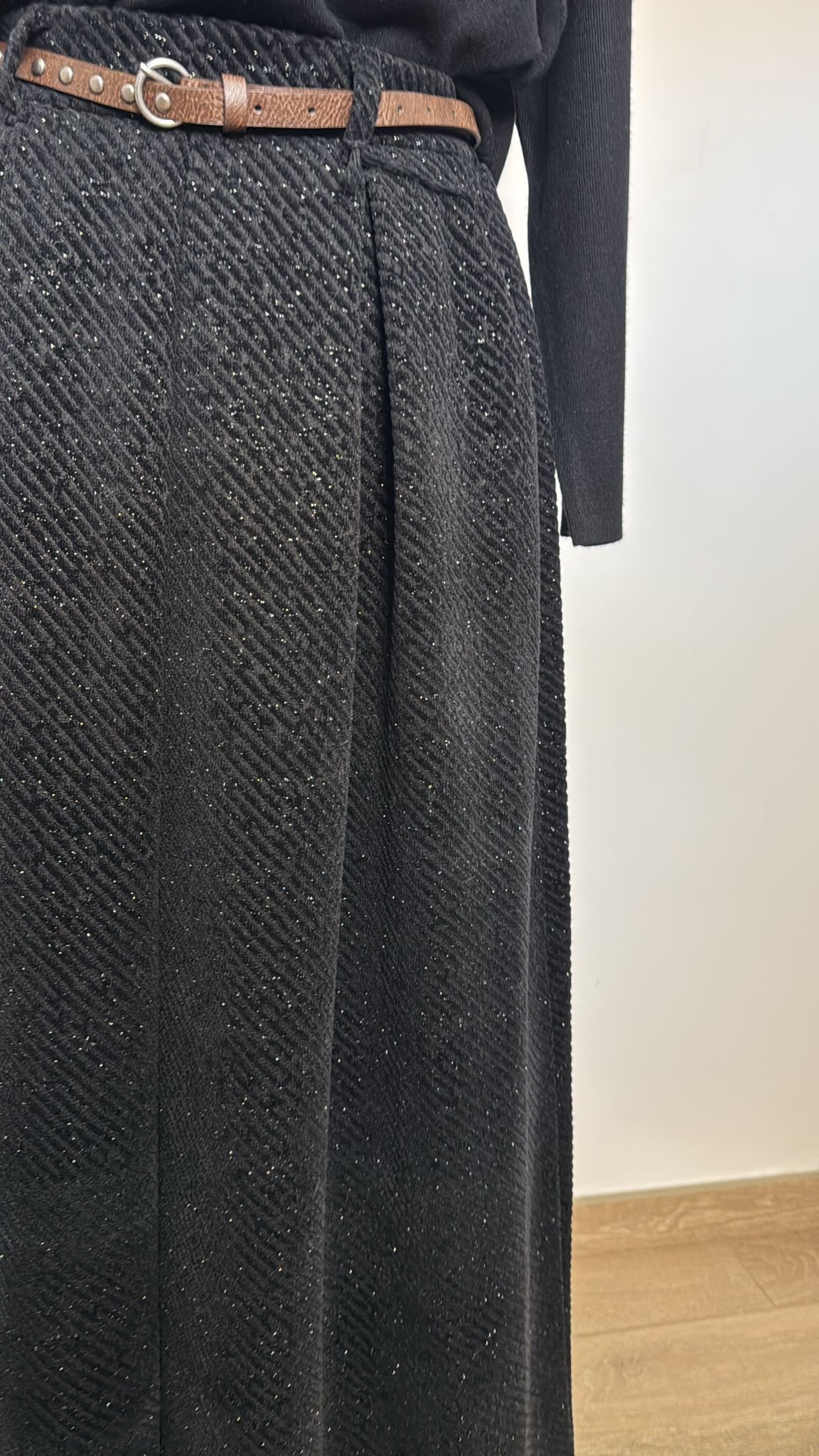Panta gonna in velluto a coste a contrasto oblique con punti luce sparsi, novità assoluta di questa realizzazione di tessuto.
