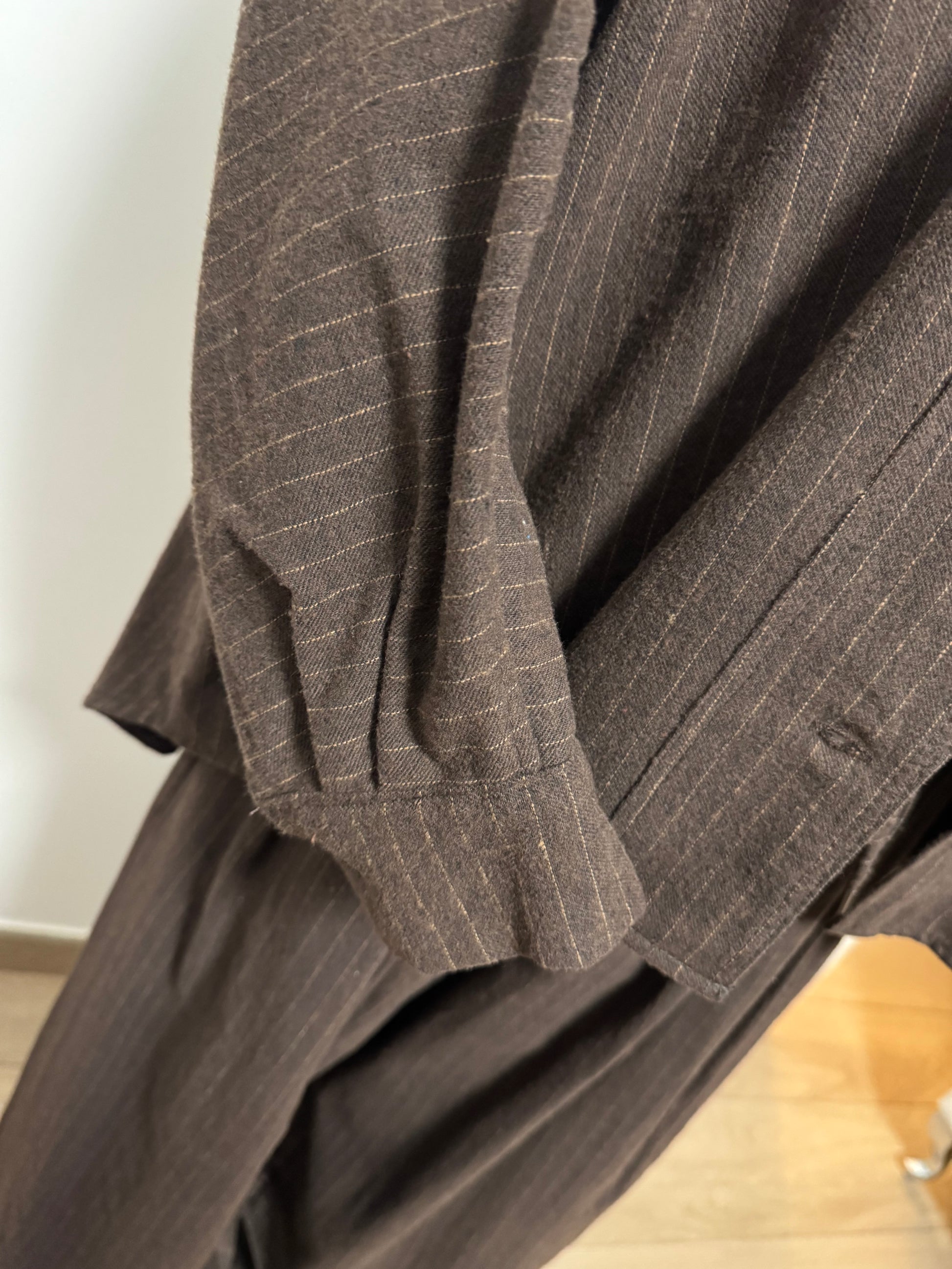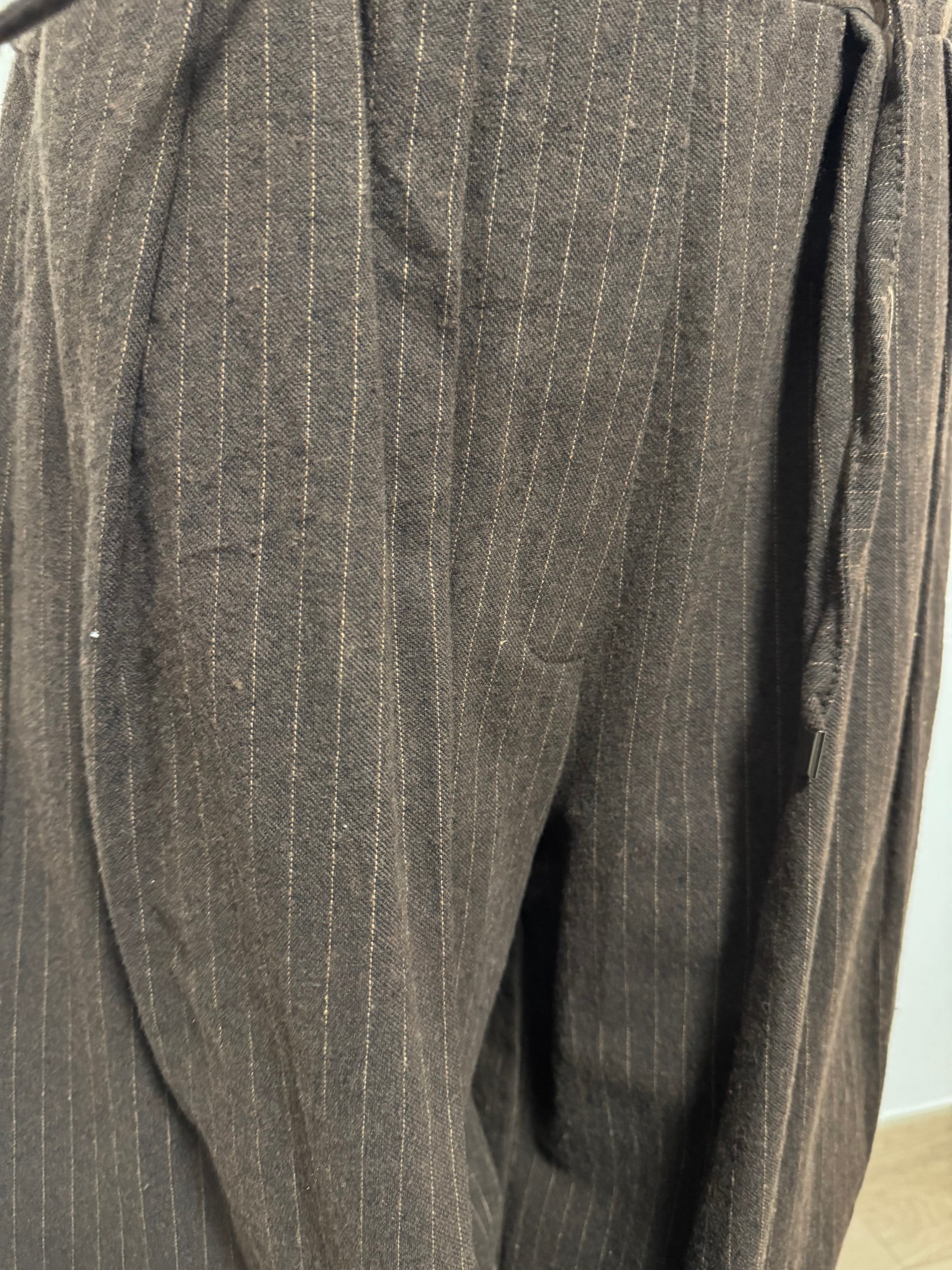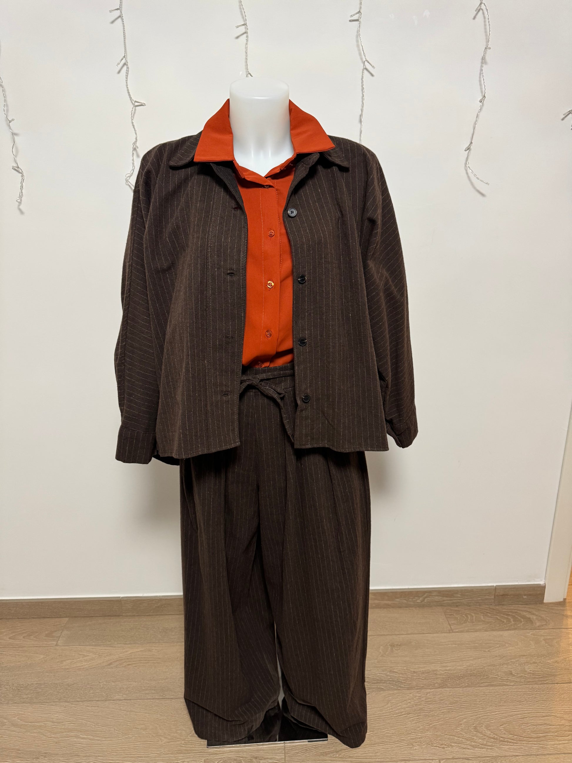 Coordinato pantalone e giacca in lana filato effetto gessato in arancione su base marrone . Pantalone con elastico e culisse in vita regolabile e pences . Giacca con allacciatura con bottoni tipo giacchetto , linea dritta .