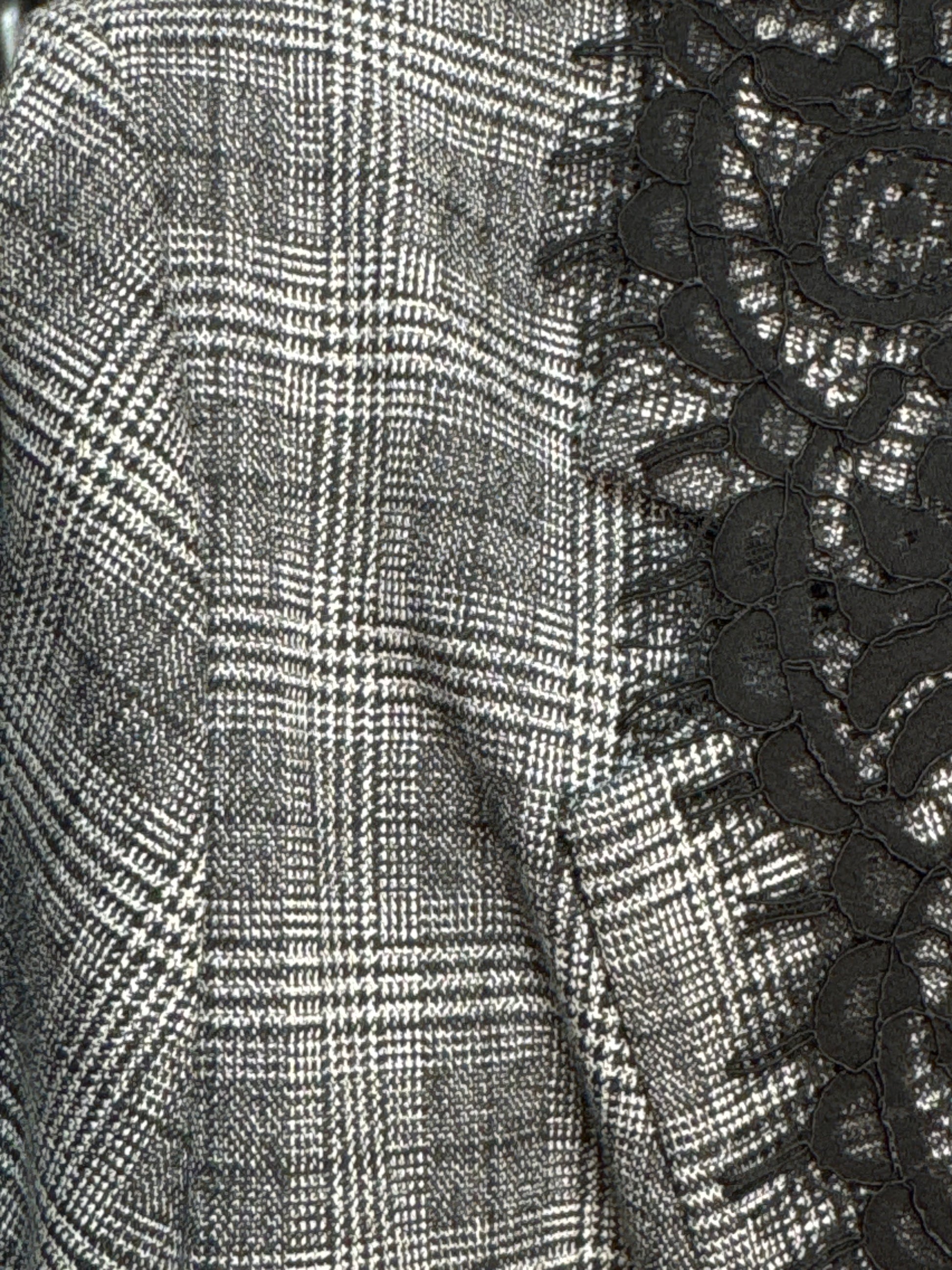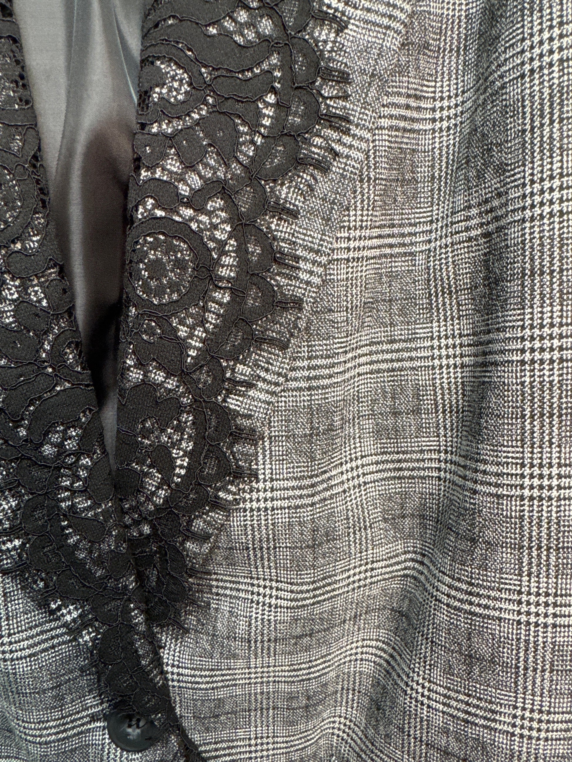 Giacca tartan sui toni del grigio e nero con profili in pizzo nero. Foderata internamente con spalline . Allacciatura bottoni . Vestibilita’ 42-48