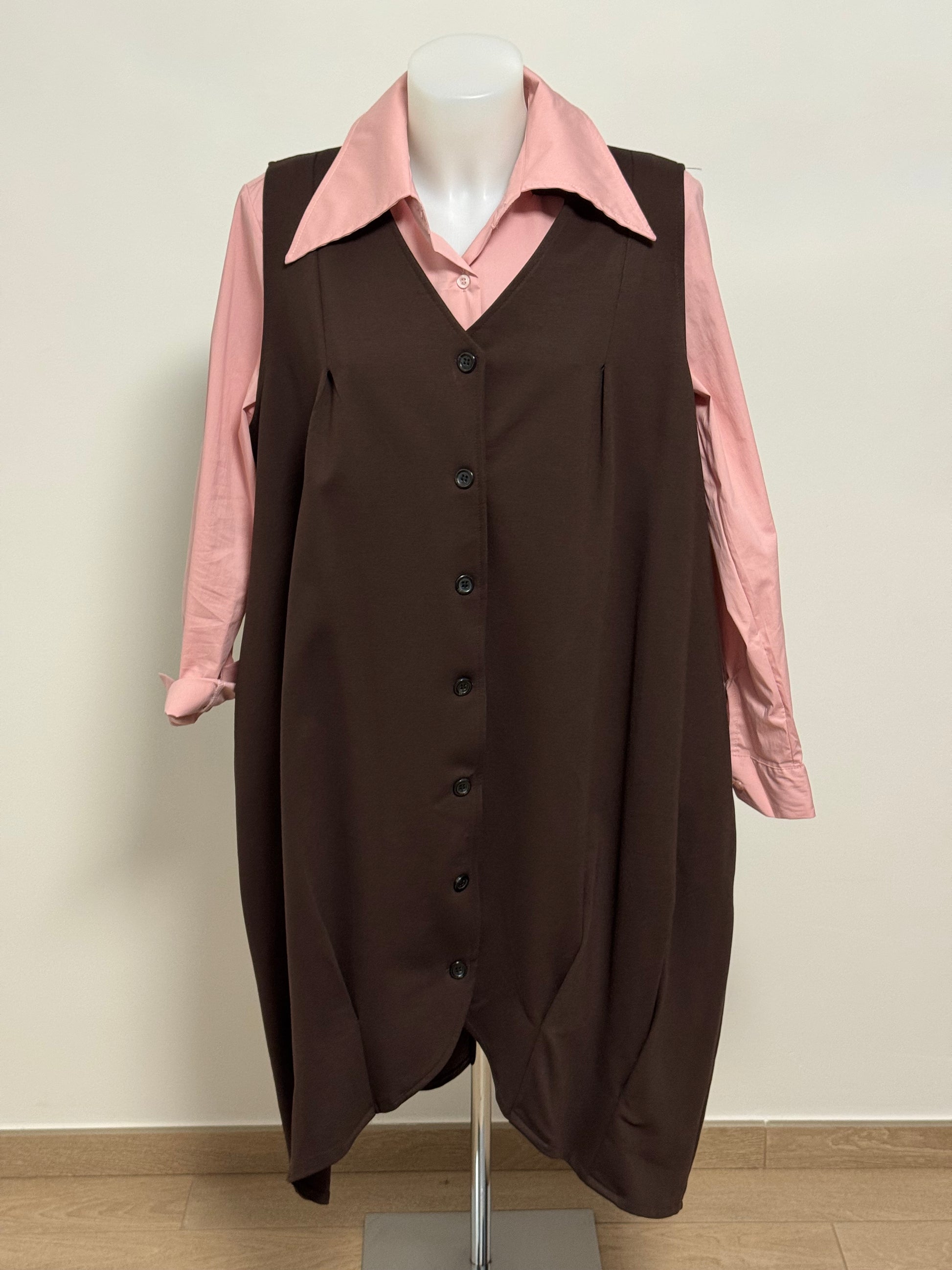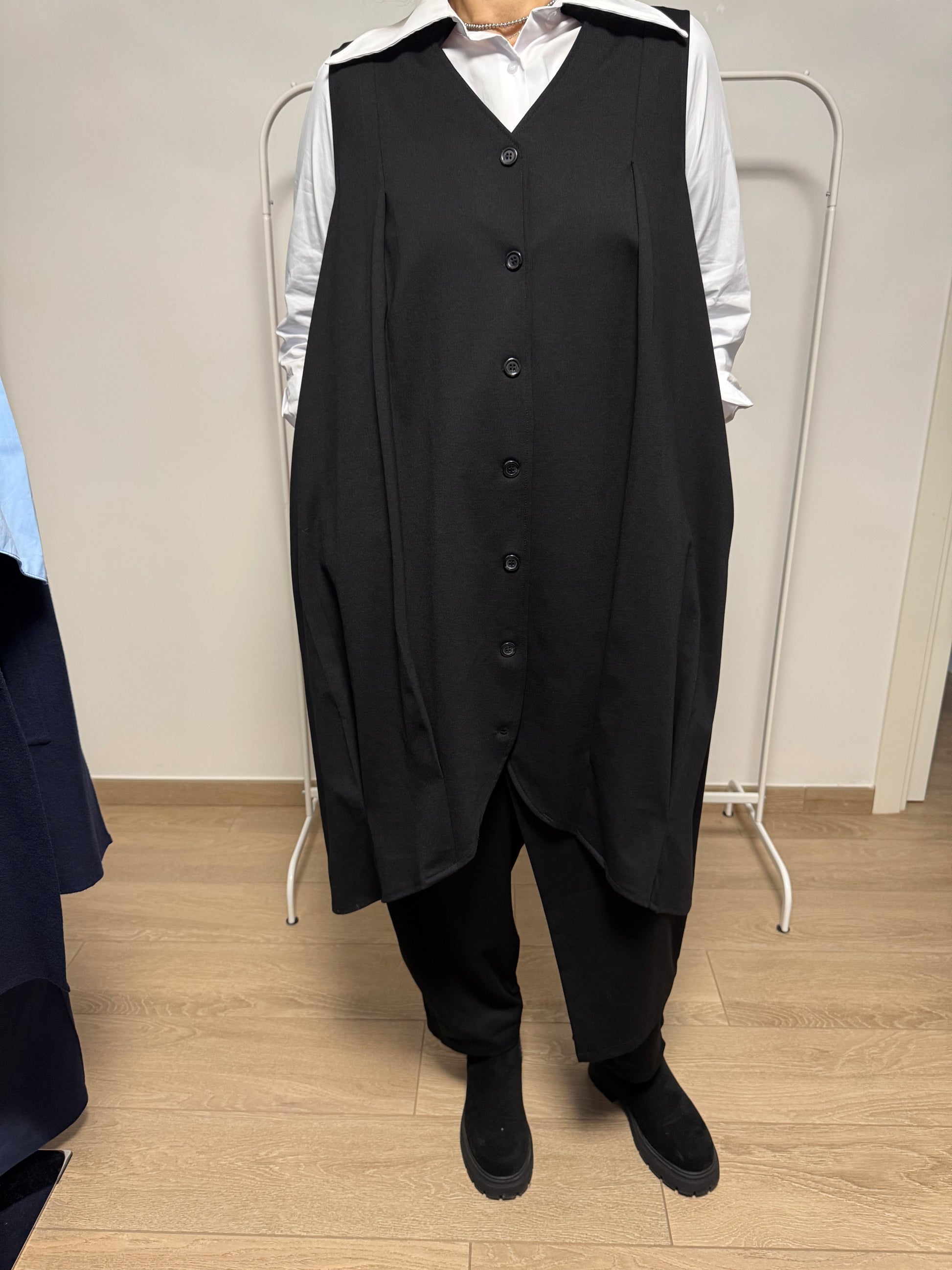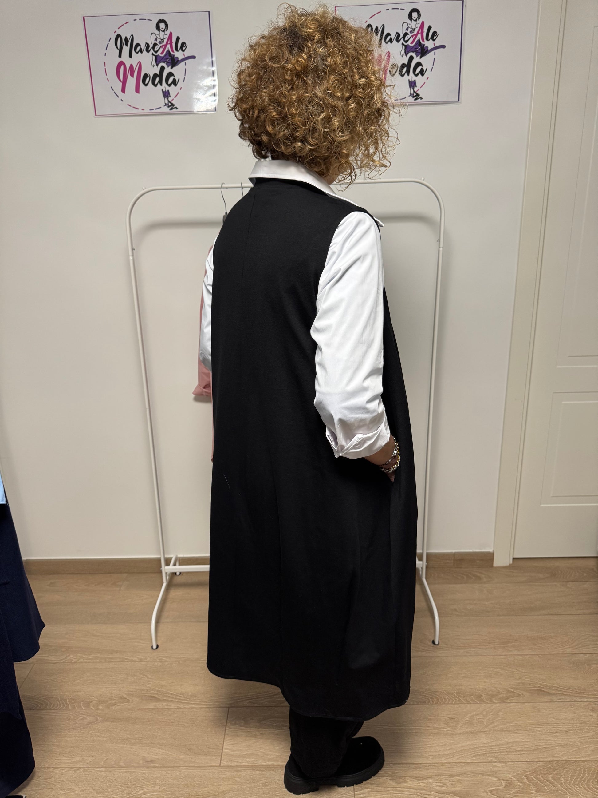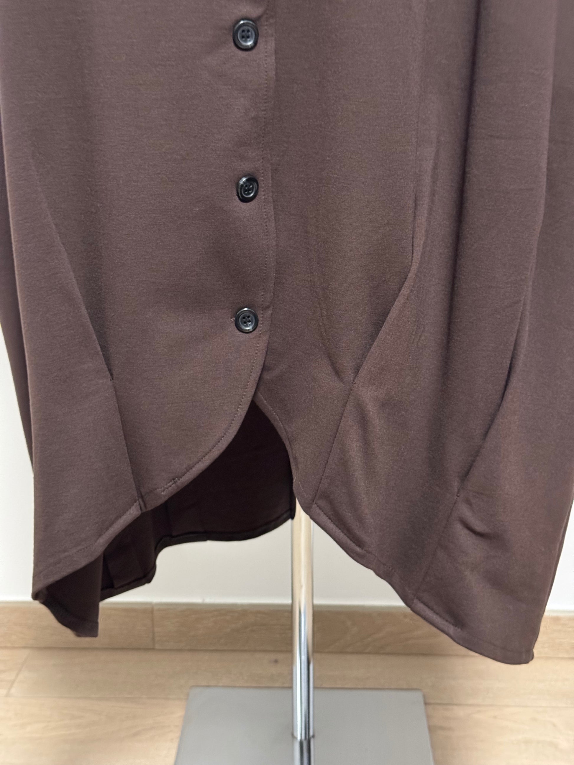 Smanicato brand 158C in punto Milano cotone e piccola percentuale di elastan. Abbottonatura sul davanti lungo. Linea ovetto realizzata da pences sul davanti e sul retro.