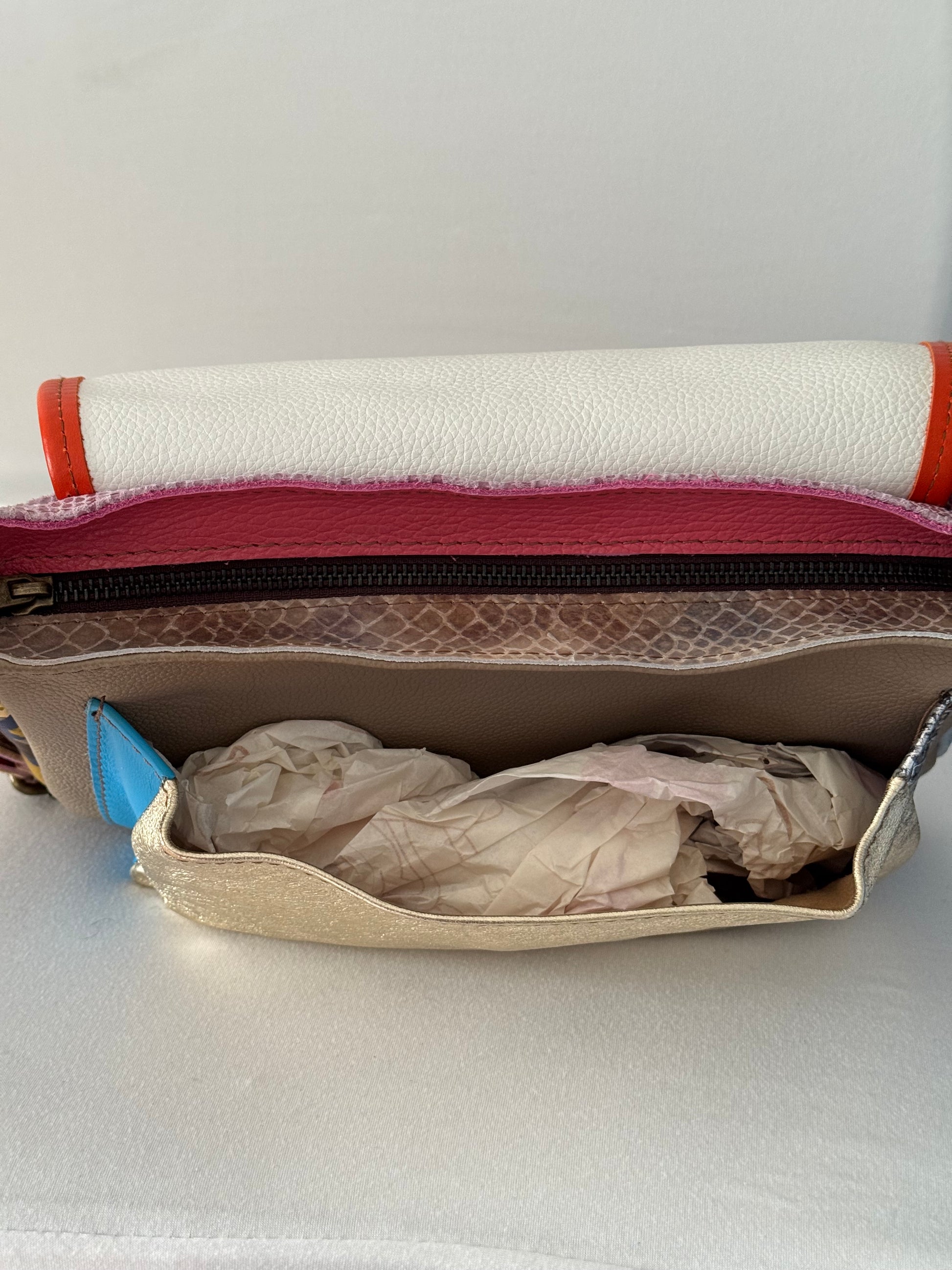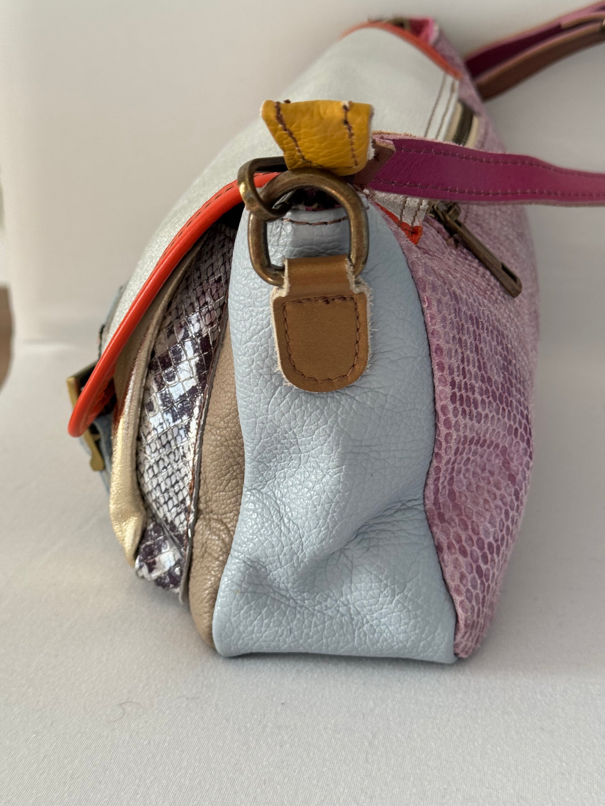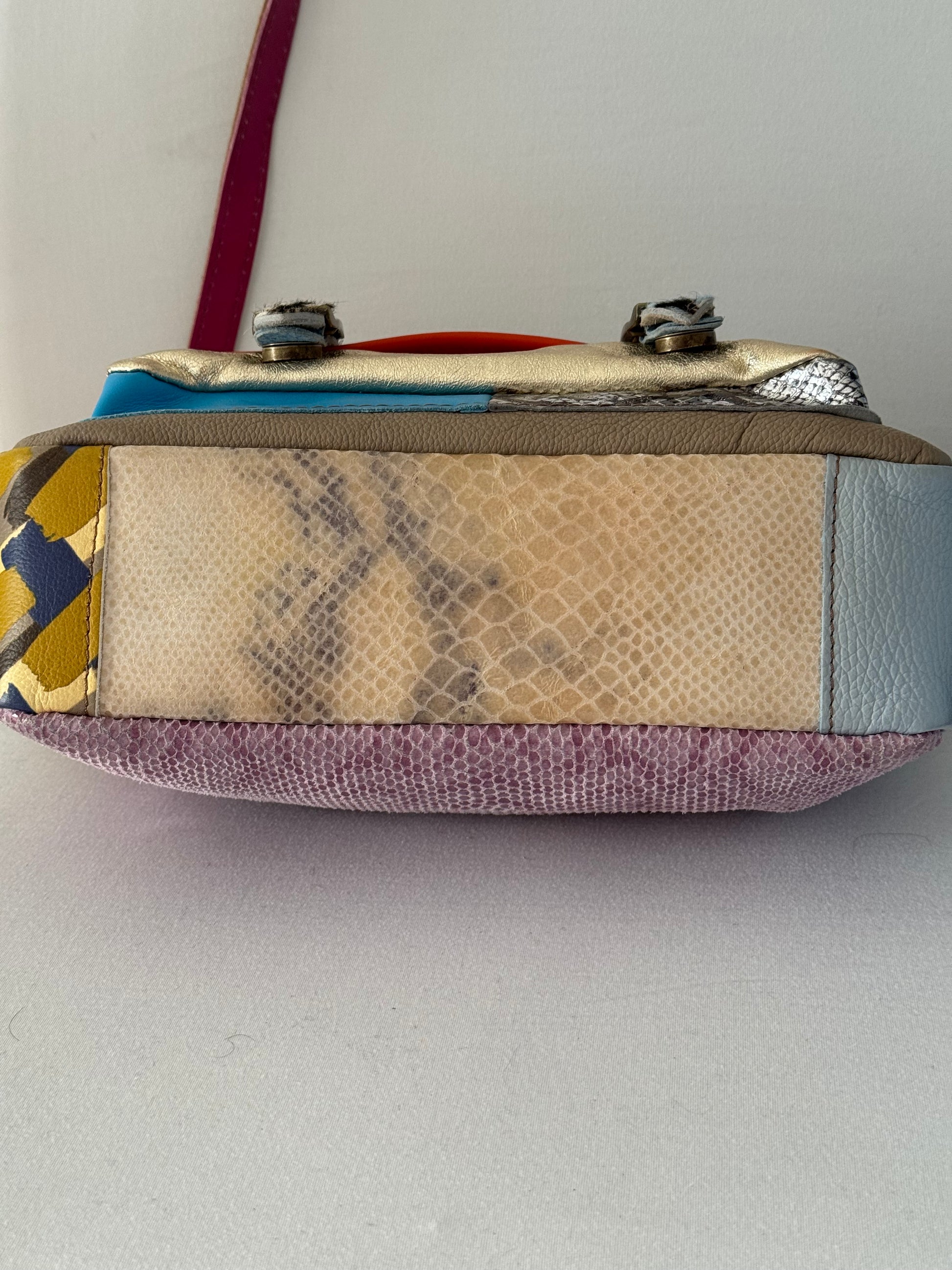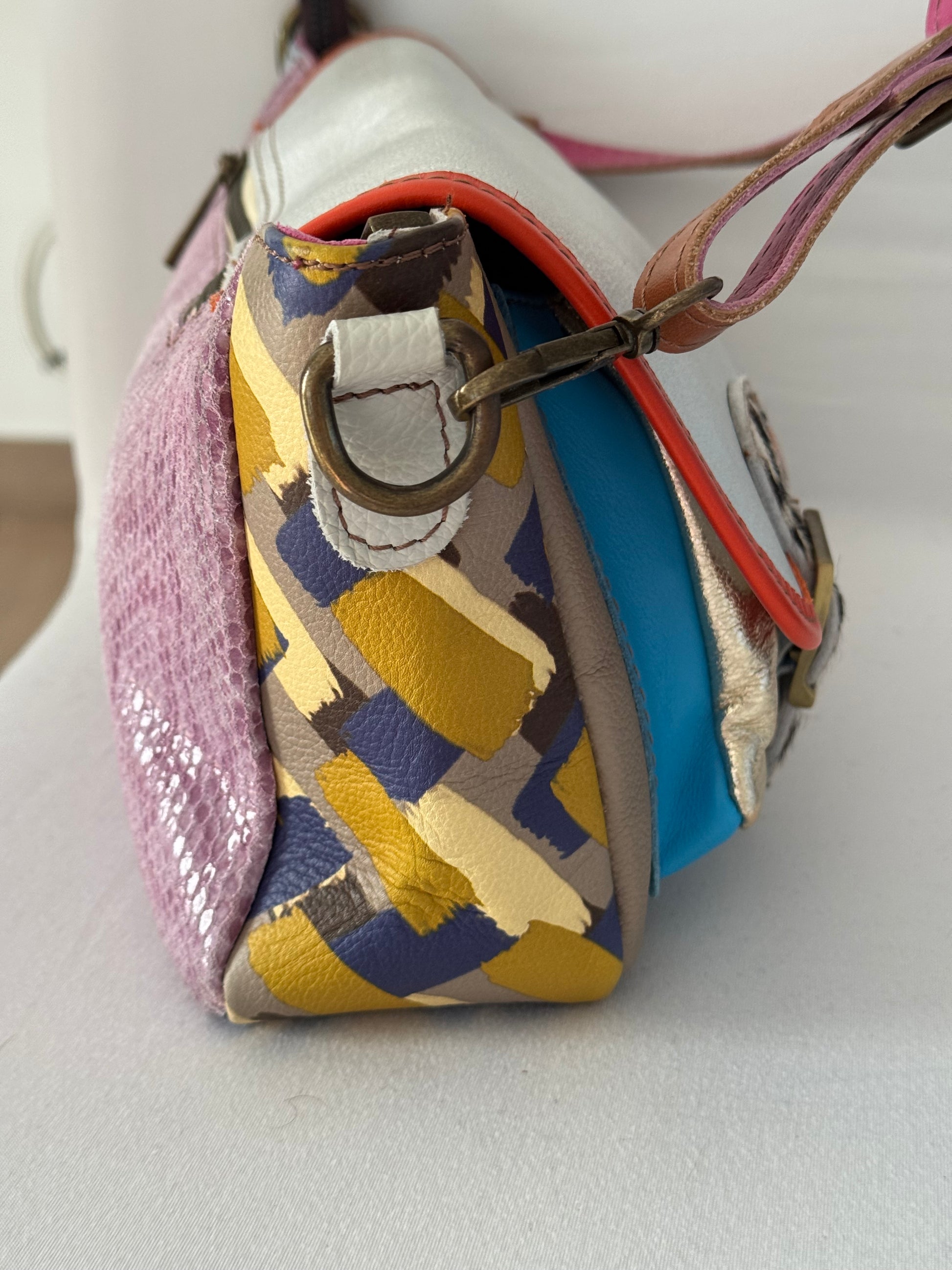 Tracolla in vera pelle realizzata interamente a mano con patch di pellami diverse stampe tali da rendere unico ogni pezzo creato. Interamente in vitello morbidissimo, molto pratica e contenitiva senza essere ingombrante per chi non ama i grandi volumi .
