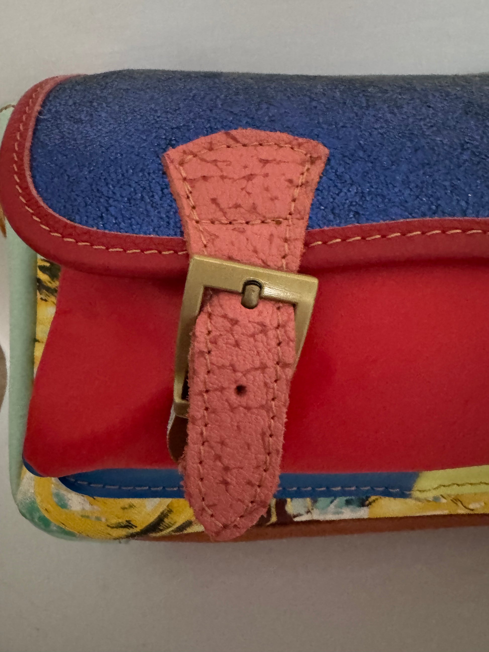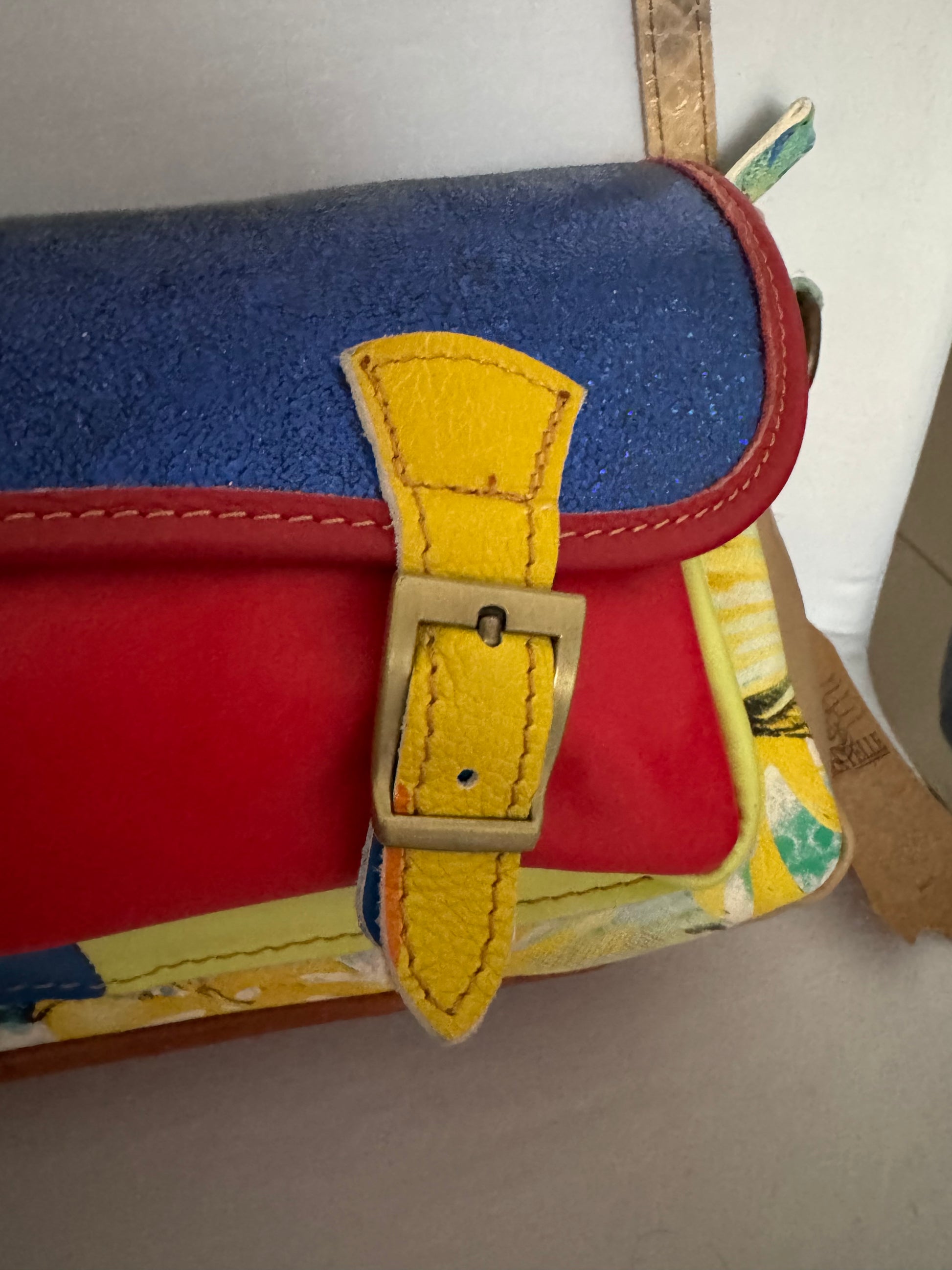 Tracolla in vera pelle realizzata a mano con patch di diverse stampe di pellame di vitello morbidissimo . Tracolla regolabile con fibbia , ampia tasca interna , doppia chiusura con patta e chiusura con zip interna .